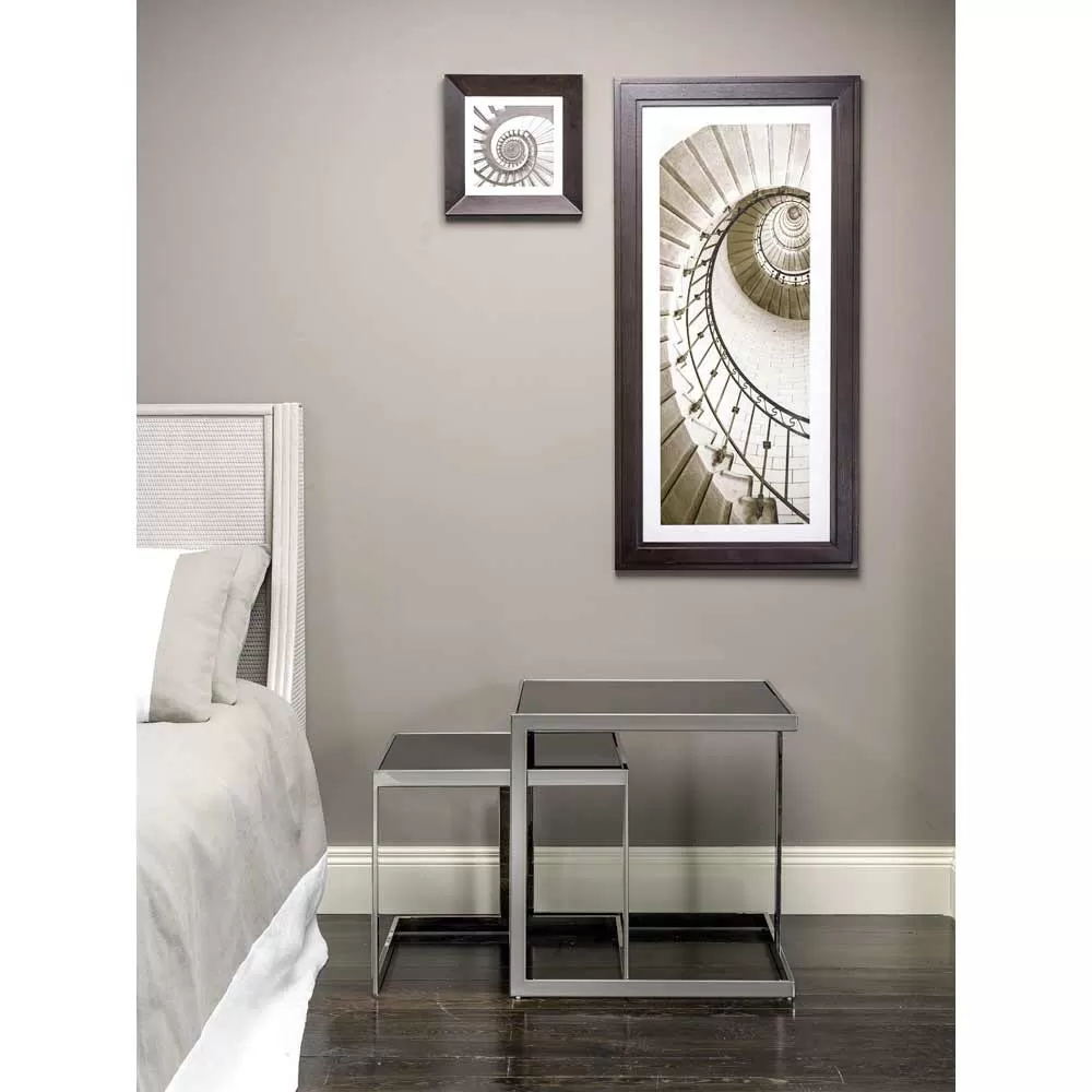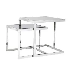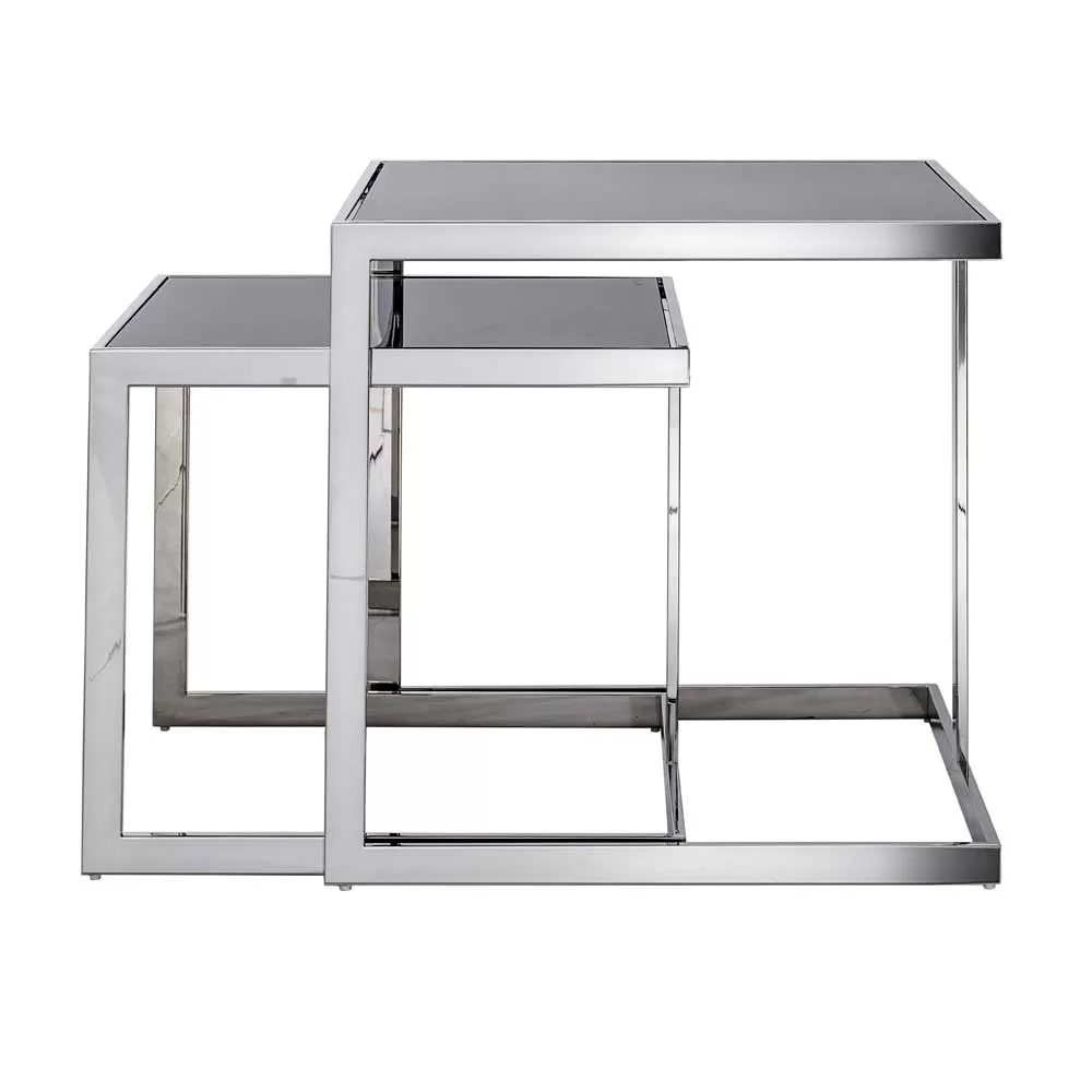 Set of 2 steel coffee tables with shelf in glossy black glass with a modern and linear design. The large coffee table measures L 50 x H 50 x P 50 cm, while the smaller one measures L 45 x H 40 x P 45 cm. Designed and created to be placed in the living room, in the bedroom or in the office.