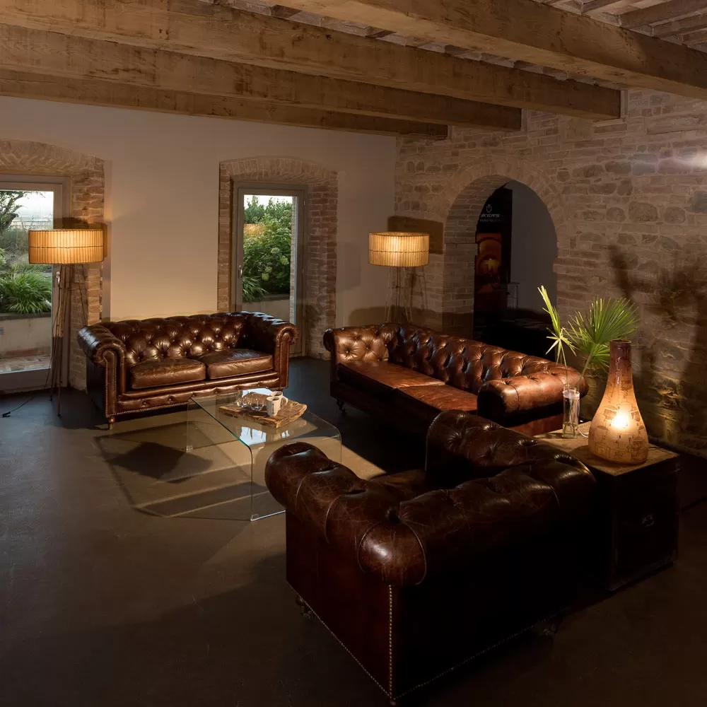 This sofa is part of a collection that can boast a timeless beauty and taste that resists the passing of fashions and the suggestions of trends. Solid and sturdy structures , capitonnée workmanship, manual punching and nailing, upholstery in real leather (fior di pelle) , worked with a particular tanning, specially designed to give the leather a vintage, aged look . The products in this collection are characterized by the refined importance of the shapes and precious materials that animate them. They are seats that prove to be perfect for embellishing high-level furnishing environments, which make elegance and character their prerogative.