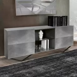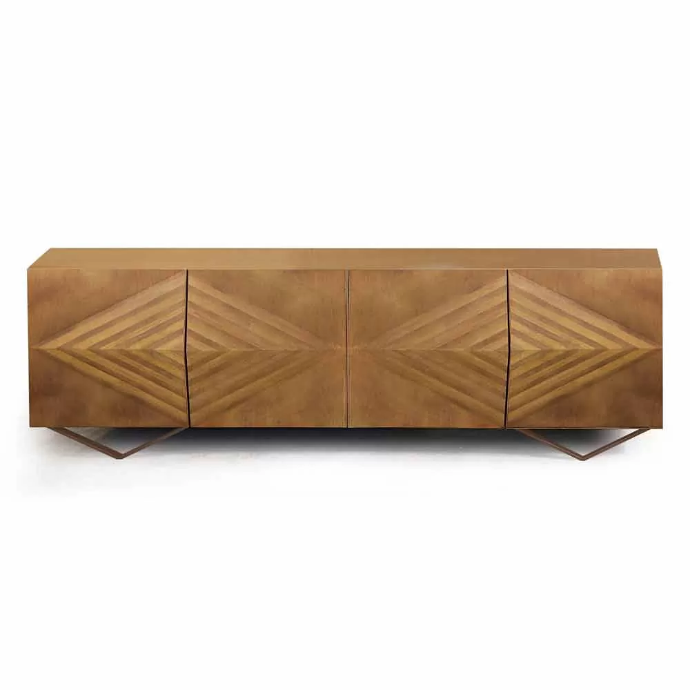 Sideboard made in Italy with lacquered wood structure, 2 or 4 doors in natural or lacquered faceted wood, internal shelves (and open compartment) in transparent glass and base in painted steel . An exclusive design that embodies functionality and elegance to give life to a versatile piece of furniture , ideal for any home environment in which it creates a wonderful harmony with the surrounding elements thanks to its strong modern personality and its marked refined style . The materials used for its construction increase its value even more and underline its quality by offering a solid and robust furniture for the living area characterized by the unique features of wood and its splendid veins.