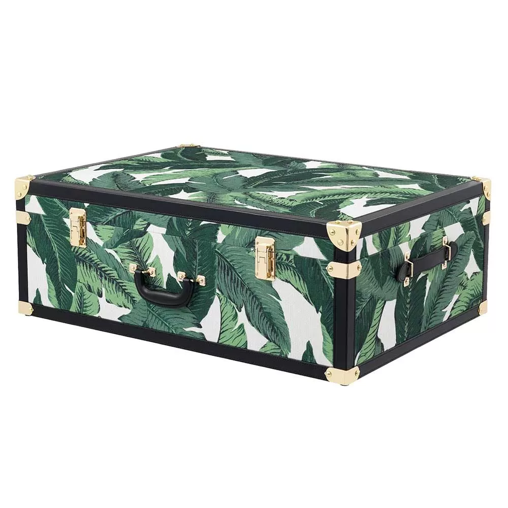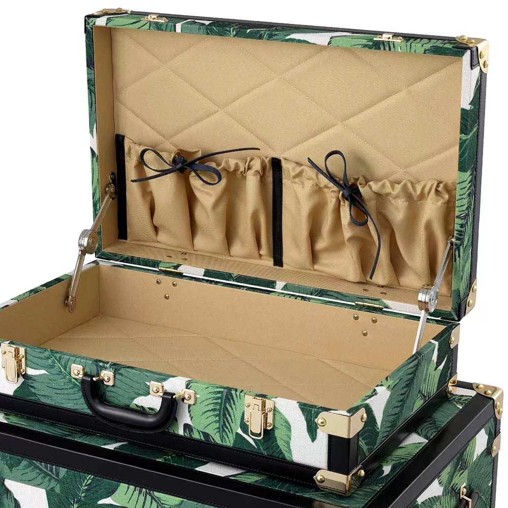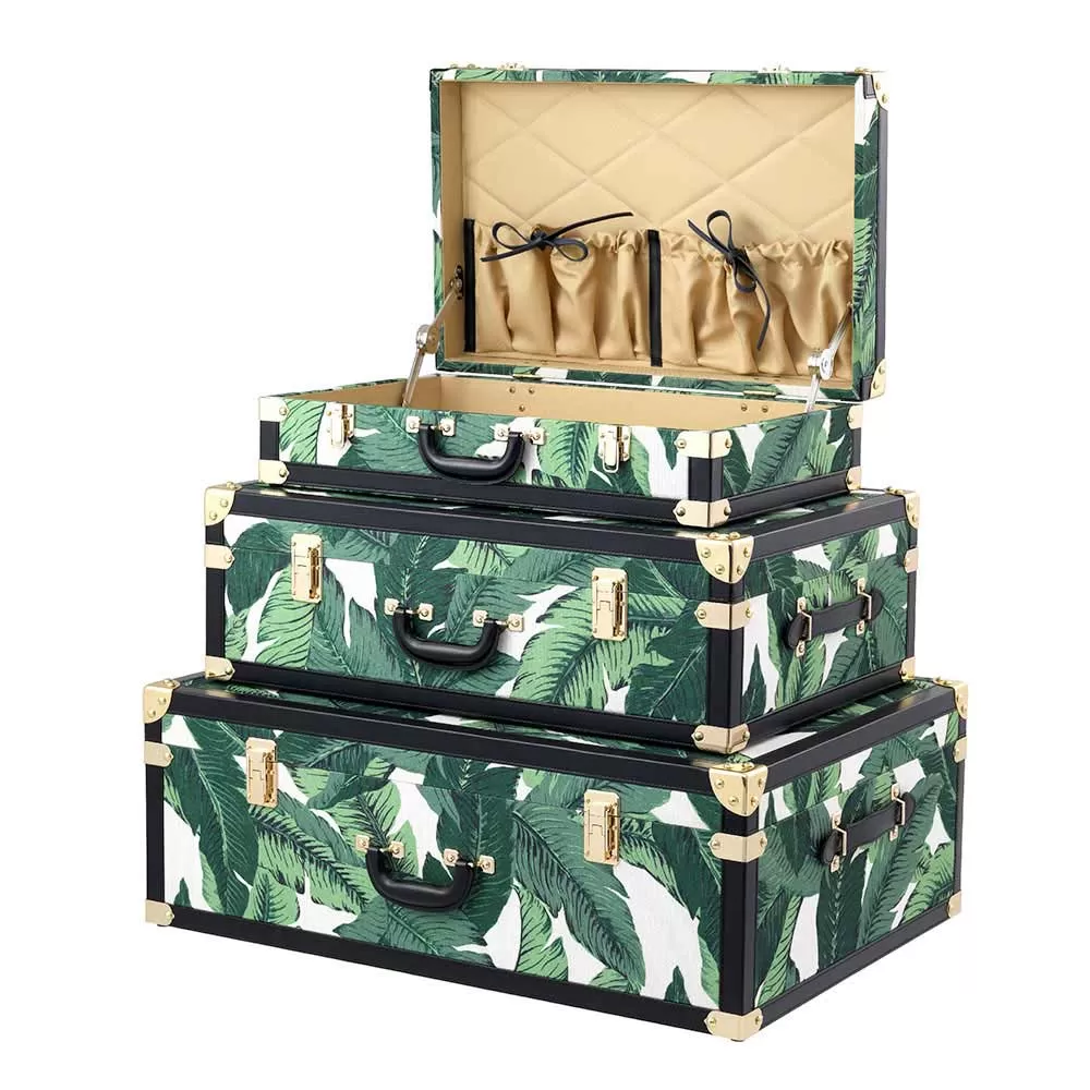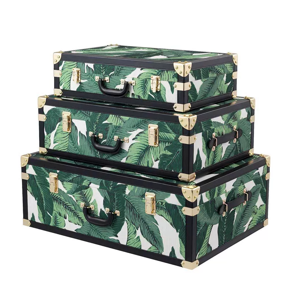 Wonderful composition of 3 trunks of different sizes with structure in mdf covered in fabric (100% polyester) enriched with golden finish details and black leather effect straps.