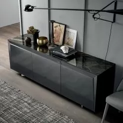 This sideboard for the living room has a design made entirely of lacquered mdf in metallic anthracite finish with 3 lacquered doors and 3 internal shelves in transparent tempered glass.