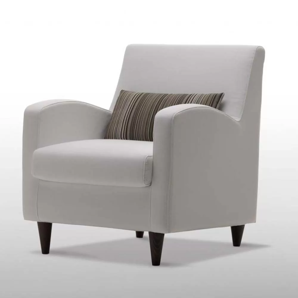 Living room armchair entirely produced in Italy with removable cover in white fabric complete with comfortable pillow rest . The armchair has conical feet in wenge-colored wood (h.10 and 13 cm). The structure is made of fir wood and chipboard with polyurethane padding and the springing uses interwoven elastic bands, while the seat cushion is padded with polyurethane foam with acrylic fiber.