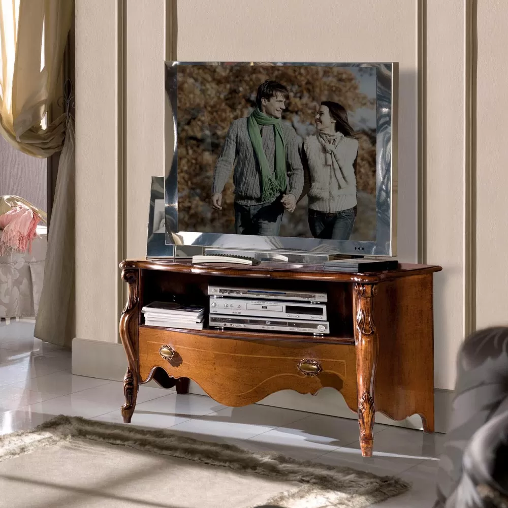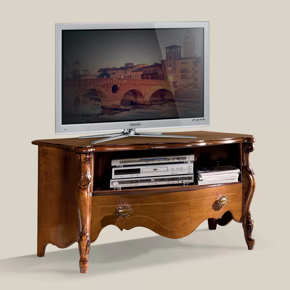 Living room TV stand  with a timeless classic style, made of Bassano walnut wood.  This piece of furniture also has a practical drawer and a compartment. A unique and refined complement, completely made in Italy by skilled master craftsmen , masters of art who finish each complement with wisdom and taste for elegance. The production is carried out using fine materials , and performing the work by hand with the utmost care and professionalism that distinguishes Made in Italy products.