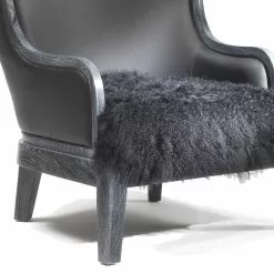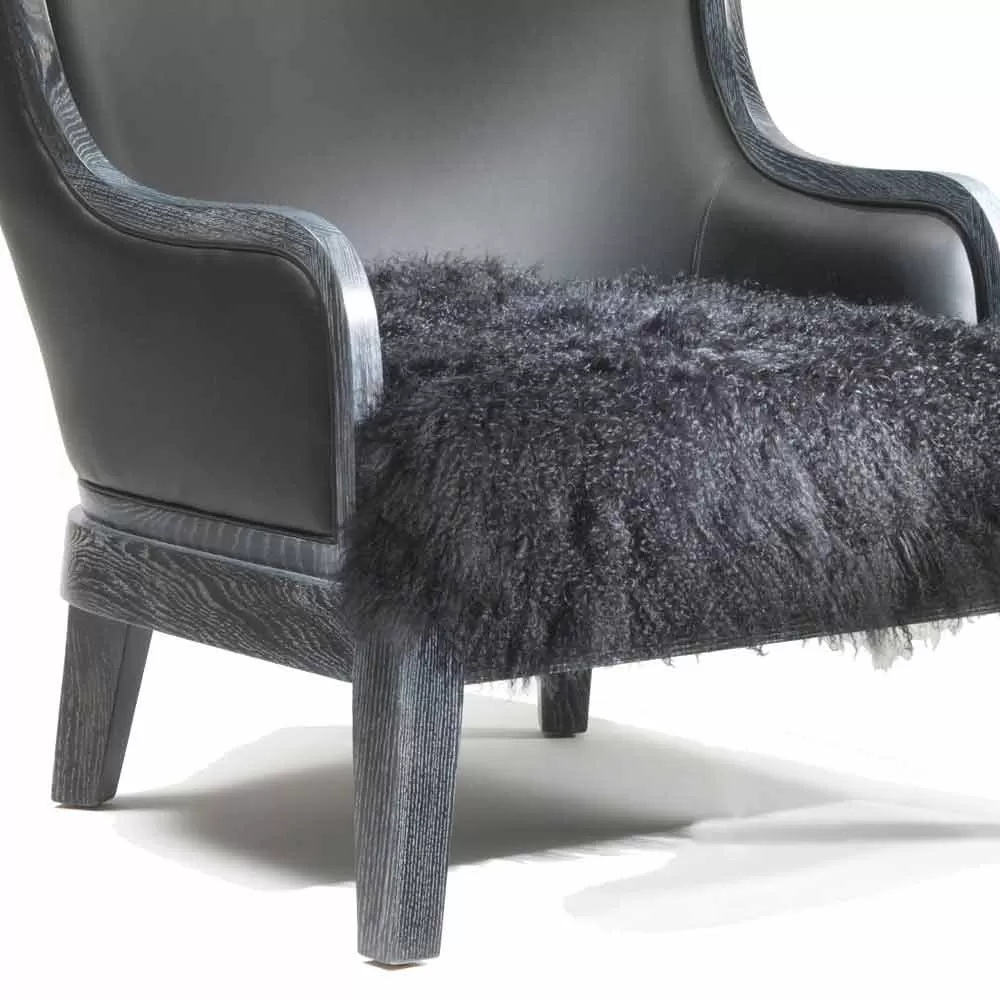 Armchair with high back. Back covered with black leather. Seat covered with black tibet lamb hair. Wooden frame and base. Finish in black oak.