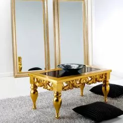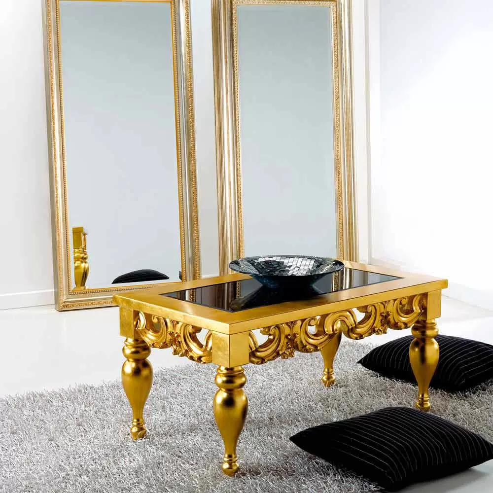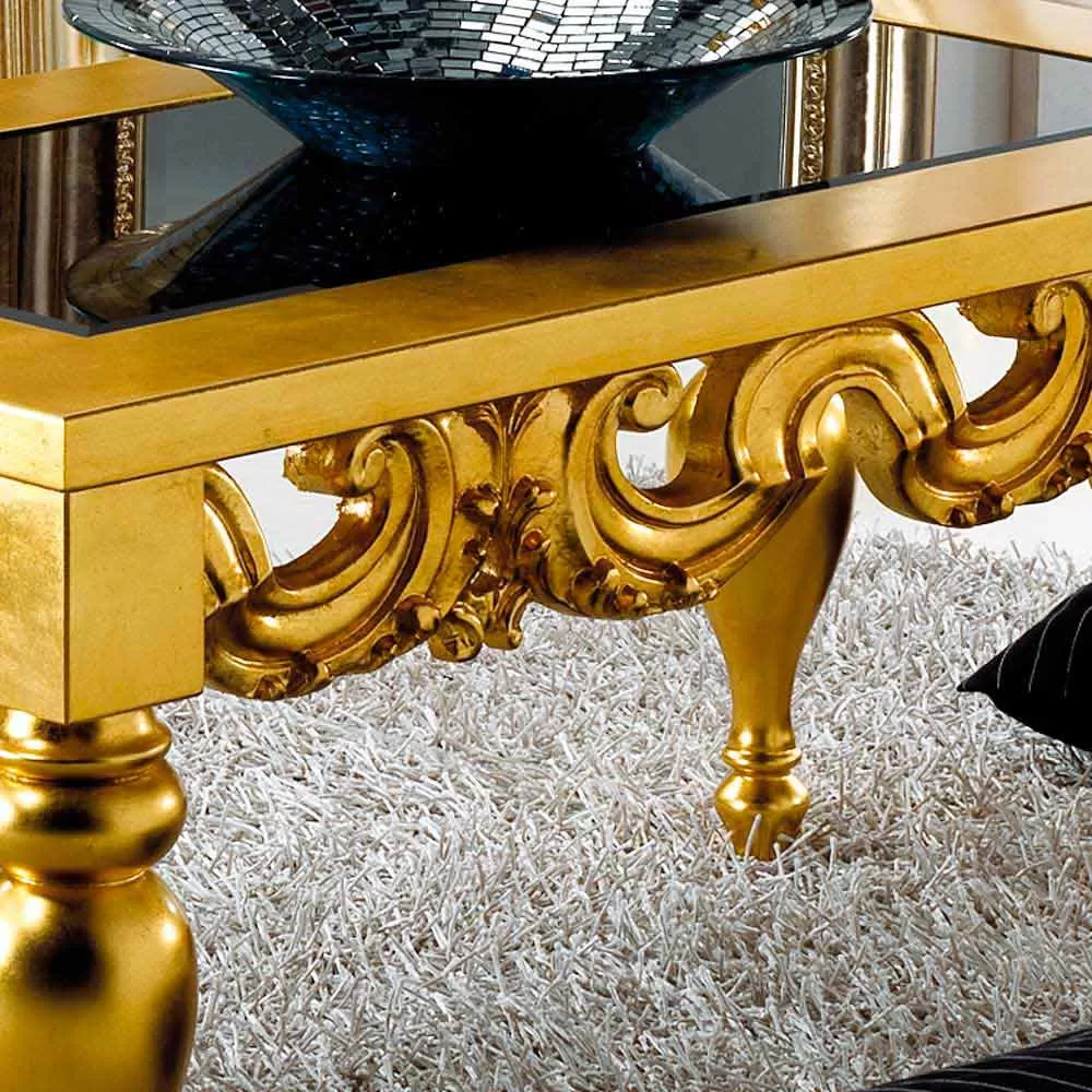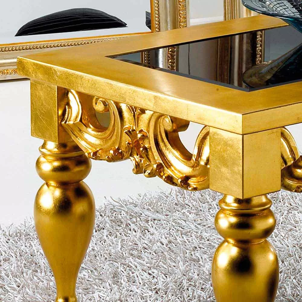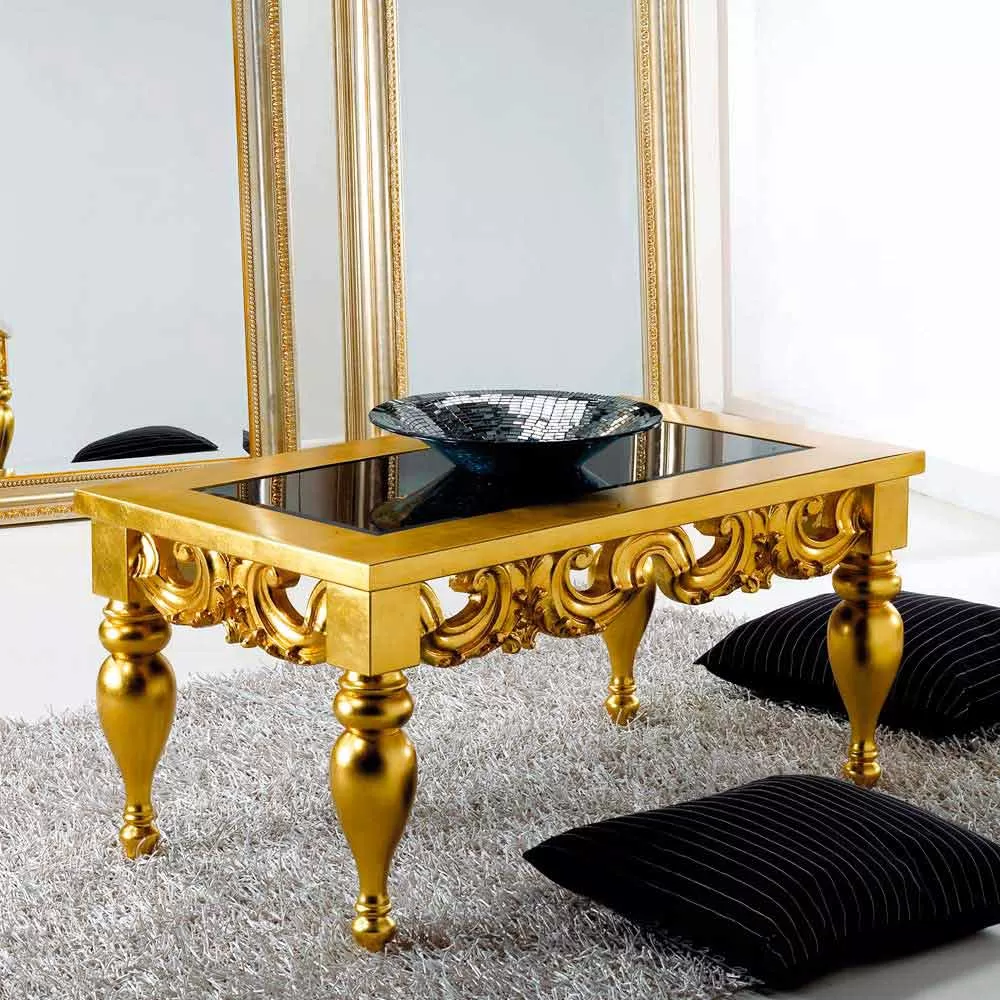 The Lof coffee table is characterized by a craftsmanship carried out using quality materials and using the experience of skilled Italian artisans. The structure is made of wood with inlaid decorations. Antique gold leaf finish. Black glass top. Made in Italy.