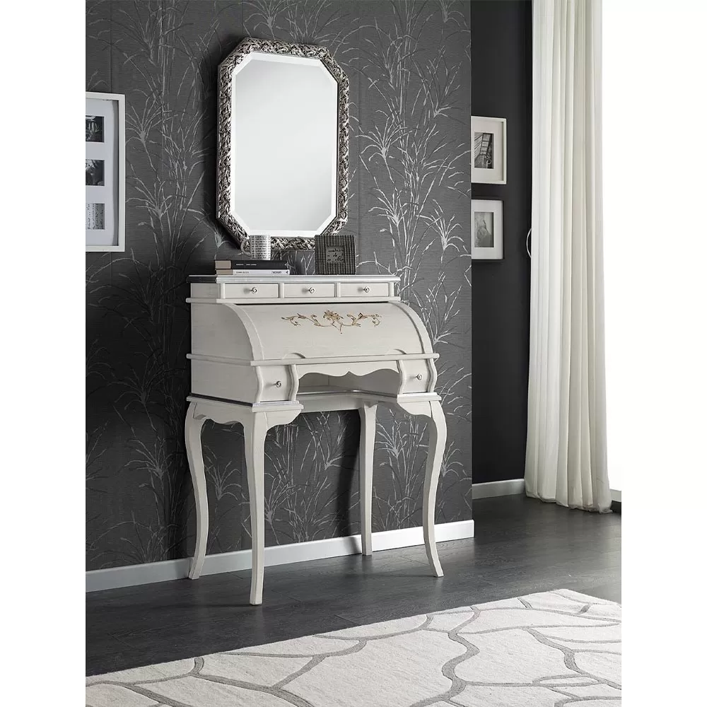 Classic style desk made of fine wood , available in walnut or white finish. This practical and refined piece of furniture has 5 drawers, an inlaid shutter and pull-out shelf , and is ideal for use as a desk or practical storage unit. Unique and refined, it is completely made in Italy by skilled master craftsmen , finished with wisdom and taste for elegance. The production is carried out using fine materials , and performing the work by hand with the utmost care and professionalism that distinguishes Made in Italy products.