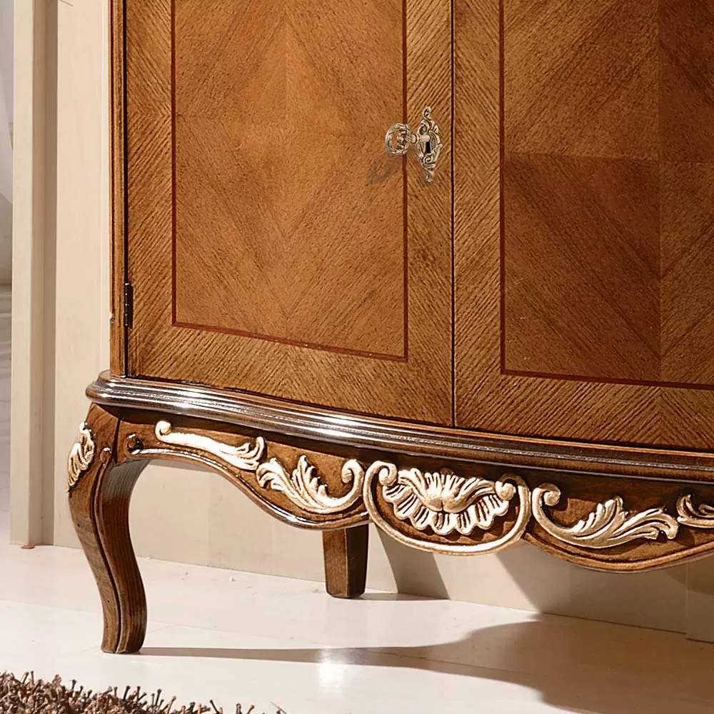 Classic style living room sideboard made with precious wood available in avio blue and antique gold finishes or Bassano walnut with herringbone inlays and gold details, a refined complement able to enrich the living area by inserting itself with elegance and sobriety . Completely made in Italy by skilled master craftsmen , finished with wisdom and taste for elegance. The production is carried out using fine materials , and performing the work by hand with the utmost care and professionalism that distinguishes Made in Italy products .