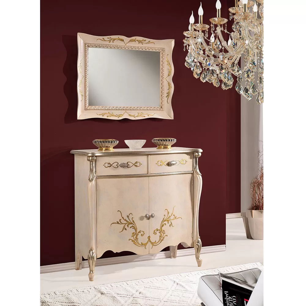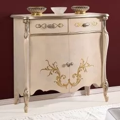Living room sideboard with a classic and elegant style complete with 2 doors and 2 practical drawers, available in Bassano walnut and antique gold or antique white finish with inlays. A unique and refined complement, completely made in Italy by skilled master craftsmen , masters of art who finish each complement with wisdom and taste for elegance. The production is carried out using fine materials , and performing the work by hand with the utmost care and professionalism that distinguishes Made in Italy products.