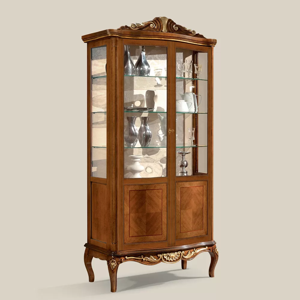 Living room display cabinet made of precious Bassano walnut finish wood and antique gold details with two doors. Elegant and timeless, this classic style display cabinet is ideal for creating impressive settings, thanks to its unique details, such as the original coping on top. Completely made in Italy and handcrafted by skilled master craftsmen , finished with wisdom and taste for elegance. The production is carried out using fine materials , and performing the work by hand with the utmost care and professionalism that distinguishes Made in Italy products.