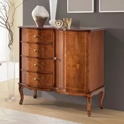 Dresser with one door and four drawers in a classic and elegant style . Made with precious polished walnut wood with golden inlays that make it a refined complement able to embellish the environment in which it is placed. Completely made in Italy and handcrafted by skilled master craftsmen , finished with wisdom and taste for elegance. The production is carried out using fine materials , and performing the work by hand with the utmost care and professionalism that distinguishes Made in Italy products.