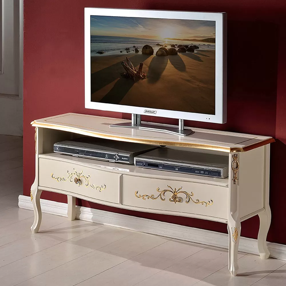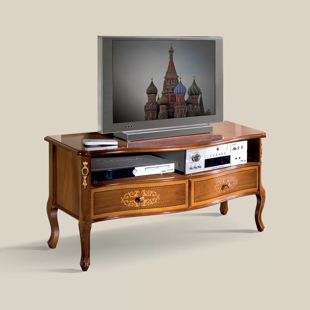 TV cabinet designed to furnish the living room with a touch of classic style made of precious polished walnut wood with elegant gold or white wood inlays and gold details. This practical and refined accessory has two inlaid drawers and two useful compartments for organizing the most varied objects in the living area. Unique and refined, it is completely made in Italy by skilled master craftsmen , finished with wisdom and taste for elegance. The production is carried out using fine materials , and performing the work by hand with the utmost care and professionalism that distinguishes Made in Italy products.