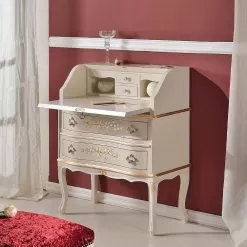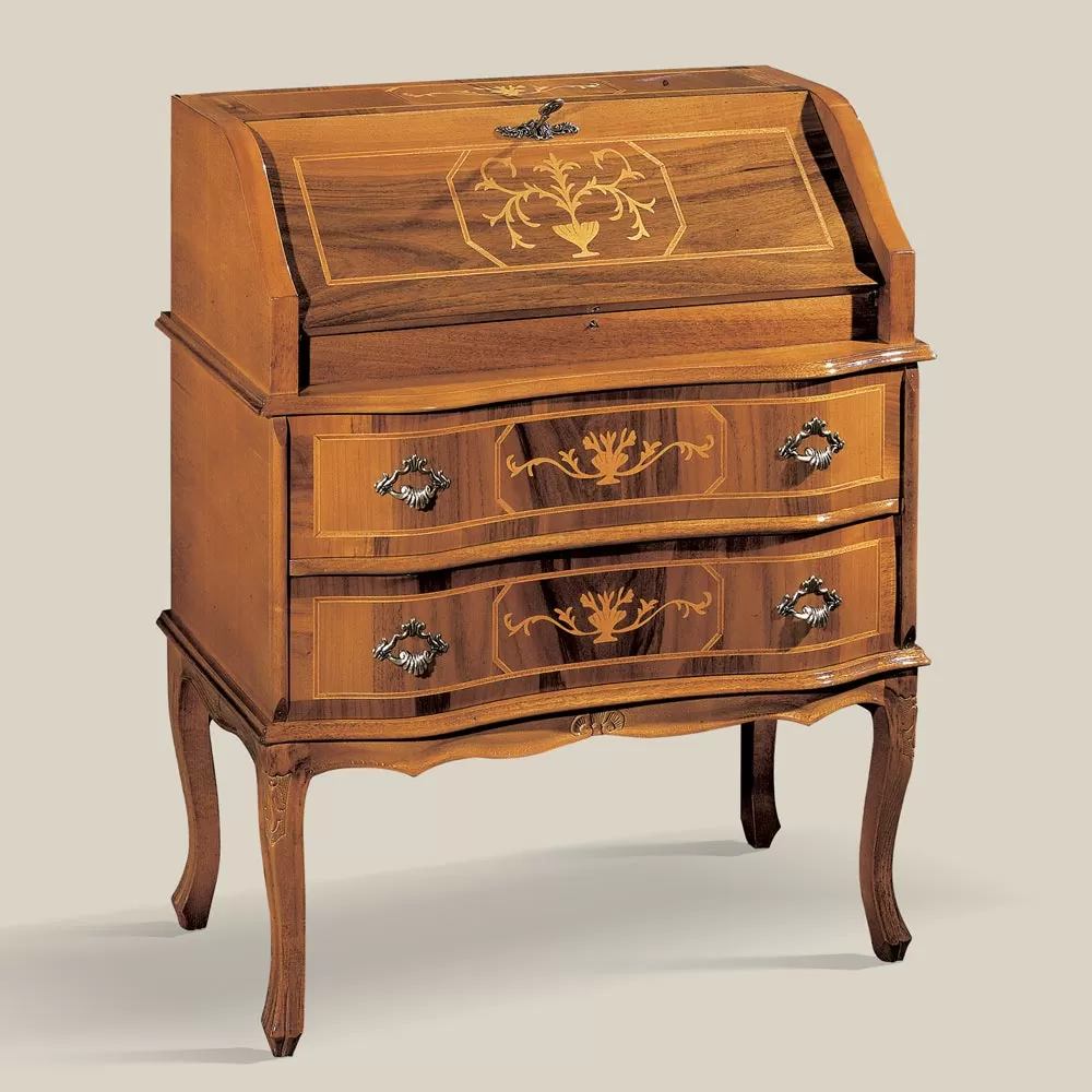 Classic style desk made of precious wood, available in walnut or white finish with golden inlays. This practical and refined piece of furniture has two drawers and an equipped flap , and is ideal for use as a desk or practical storage unit. Unique and refined, it is completely made in Italy and handcrafted by skilled master craftsmen , finished with wisdom and taste for elegance. The production is carried out using fine materials , and performing the work by hand with the utmost care and professionalism that distinguishes Made in Italy products.