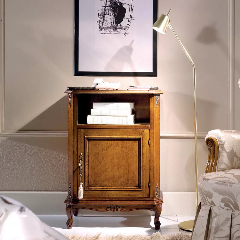 This classic style telephone holder fits elegantly into environments such as entrances, living rooms or bedrooms, made of precious Bassano walnut wood , it has a door and a compartment.