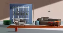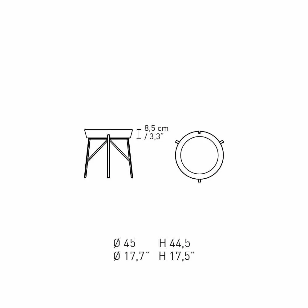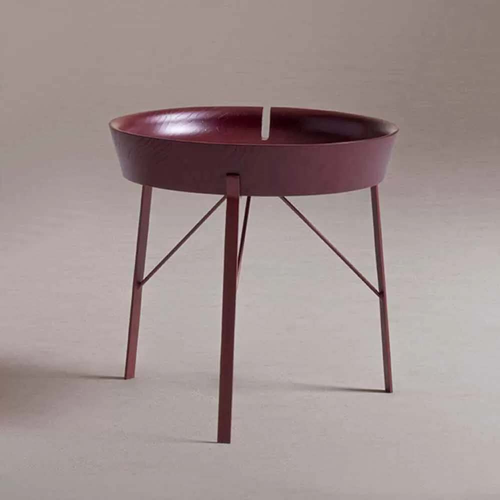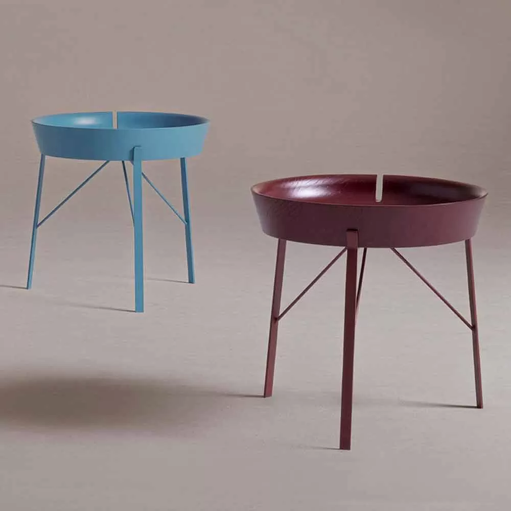 This round coffee table for the living room has three thin legs that support a shelf that resembles a basket, characterized by high edges as if it were a nest that holds everything that rests.