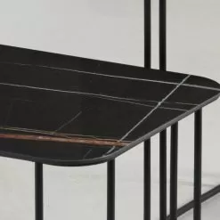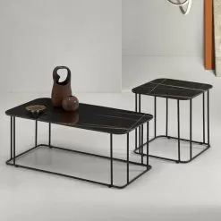 Coffee table made through a 100% Made in Italy production with ceramic top with marble effect layered on glass and black painted metal structure . An original and versatile design, punctuated by rounded shapes and sinuous lines that give life to a wonderful and elegant harmony creating a sense of dynamism. Its aesthetic is made unique by the wonderful marble effect top that gives a refined touch to the coffee table  making it at the same time a practical and functional table top and a classy decorative element that completes the surrounding furniture with personality and taste.