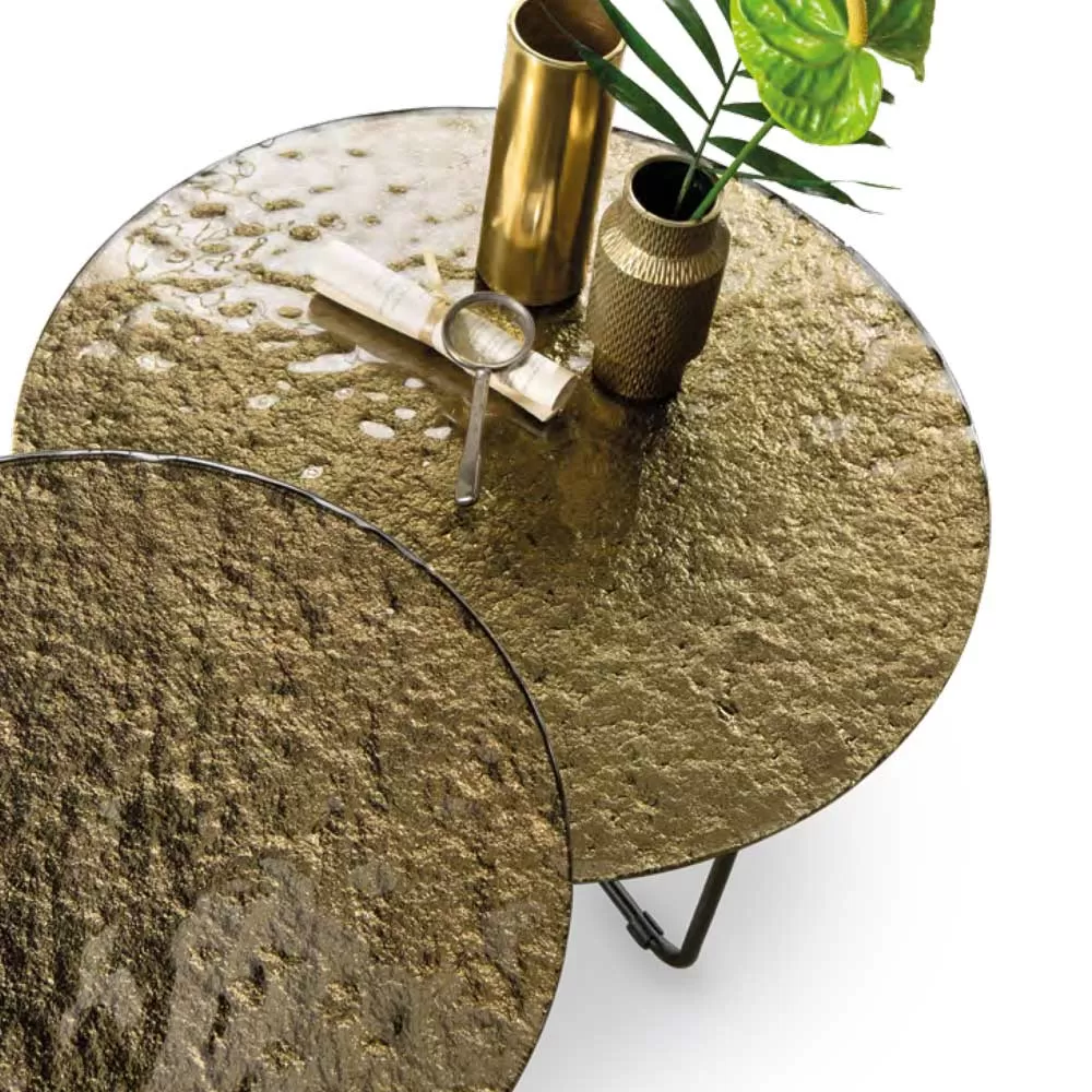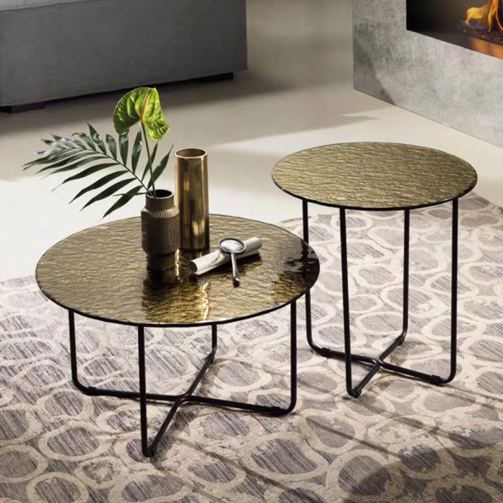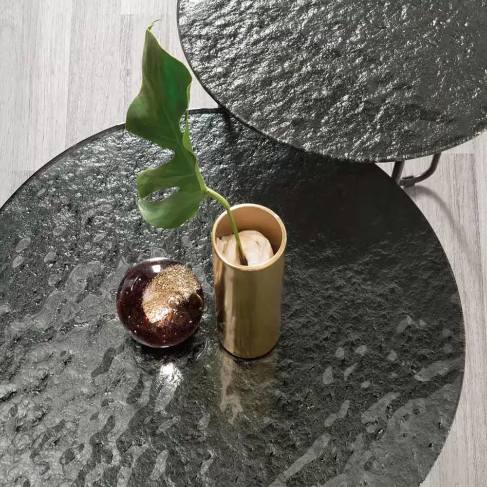 Coffee table with round top made of tempered glass with hammered effect and structure in black painted metal . A design punctuated by rounded and sinuous shapes and lines that give life to a wonderful and elegant harmony and create a sense of dynamism. Its aesthetic is made unique by the wonderful hammered effect top that gives a refined and avant-garde touch making it at the same time a practical and functional table top and an elegant decorative element that completes the surrounding furniture with personality and taste.