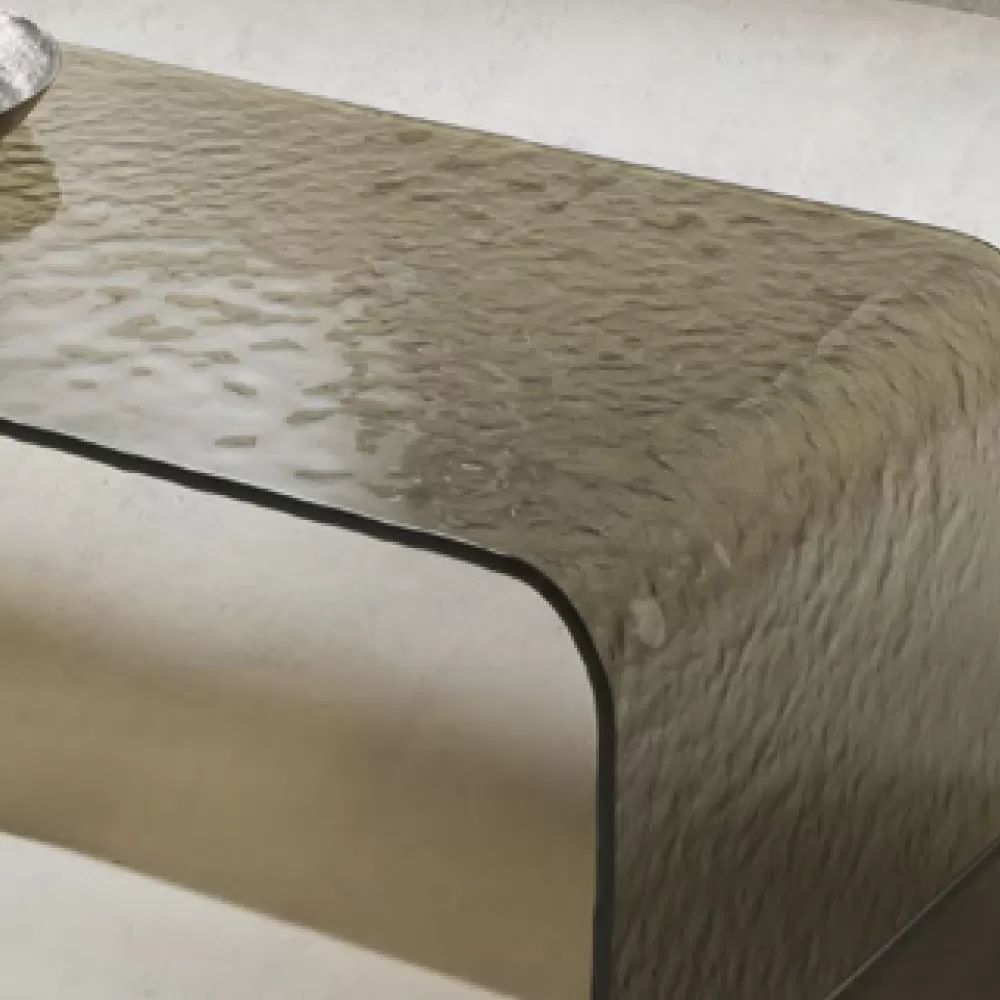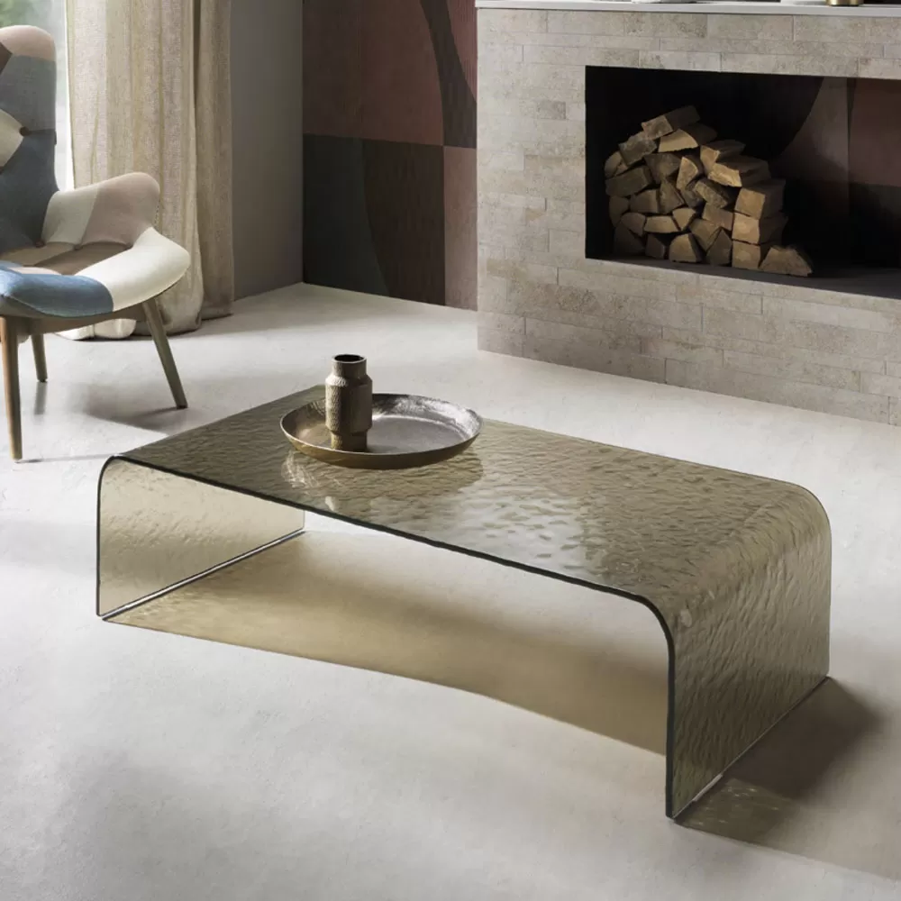 Coffee table made in Italy in curved tempered glass with hammered effect . Modernity and elegance come together in a single product and give life to this wonderful furnishing accessory with a refined soul, ideal for completing living areas with a contemporary style in which it conquers the leading role thanks to its charm. The wonderful glass processing used on its entire surface increases its value and uniqueness for a refined , exclusive and strong visual impact result . The two finishes proposed make it perfect for enriching any stylistic context with personality while offering a practical table top and an elegant design complement.