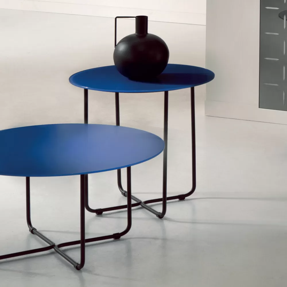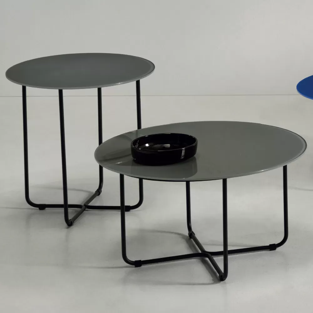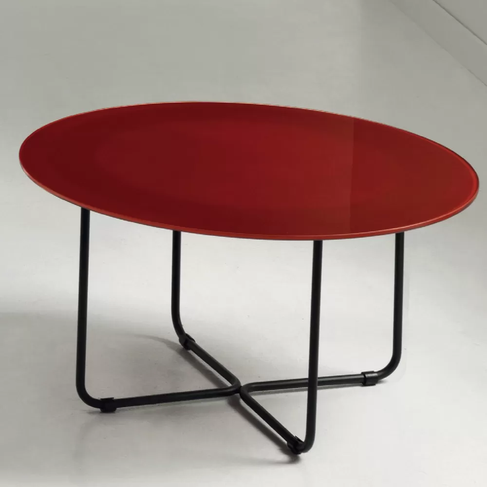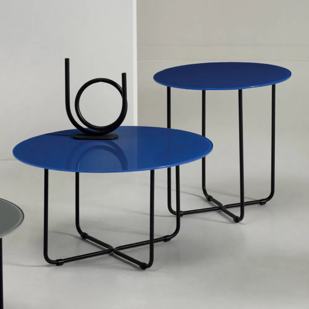 Coffee table with round top in painted tempered glass and structure in black painted metal . A decorative element that comes from a 100% Made in Italy production through the use of quality raw materials which help to ensure a final result of high quality and attention to the smallest details. Its design is punctuated by rounded shapes and sinuous lines that create harmony and give a sense of dynamism to the product while its aesthetic is made unique by the wonderful painted top that gives the table an original and refined touch .