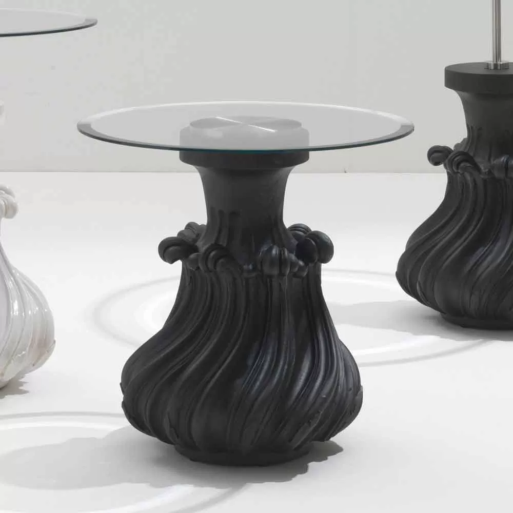 Cocktail table with solid wood base carved by hand. Top in cut crystal with 20 mm electro-welded steel plate. Finish available in sandblasted black Charcoal.