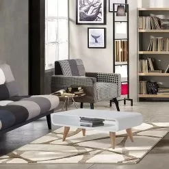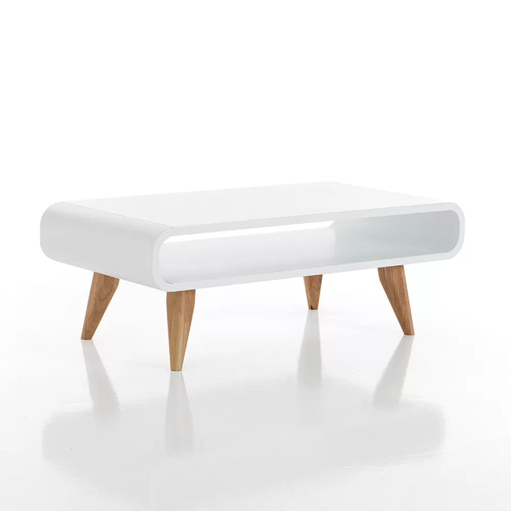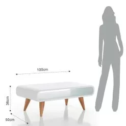 Coffee table with solid wood legs in oak finish and top made of semi-gloss white lacquered mdf (thickness 2cm). A complement with an original design and strong functionality capable of enriching and completing the center of your living area while offering a practical open compartment useful for organizing magazines, books, remote controls or other objects to always keep at hand in the living room. Its simple aesthetic but with a strong visual impact combines elegance, design and functionality at the same time, thus creating the perfect coffee table ideal for those who love an original, avant-garde and refined style .