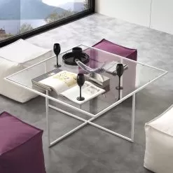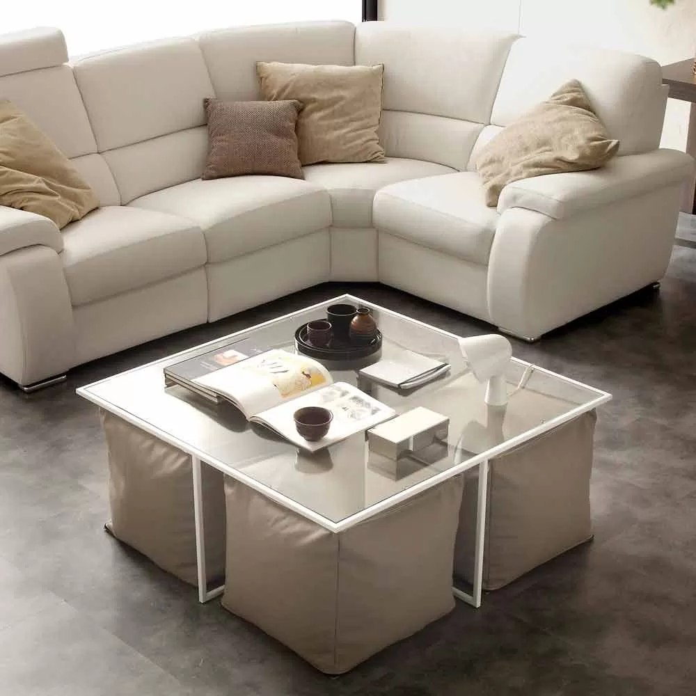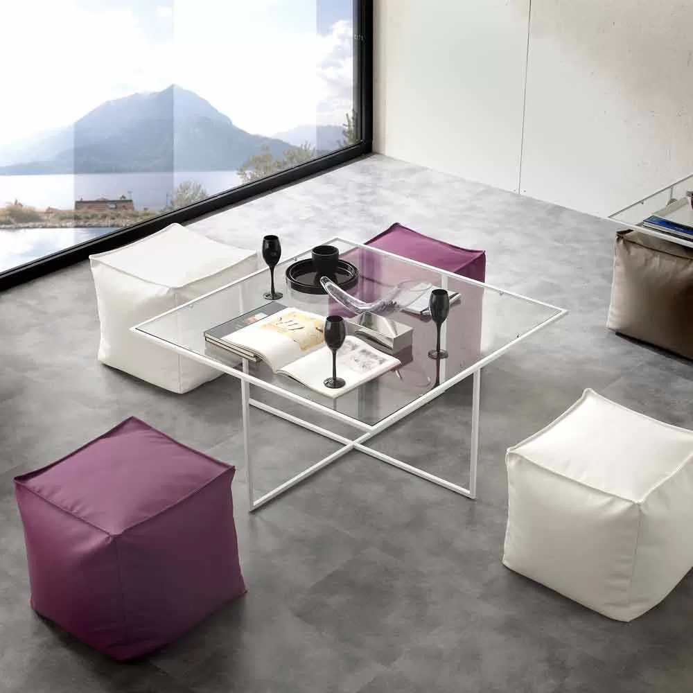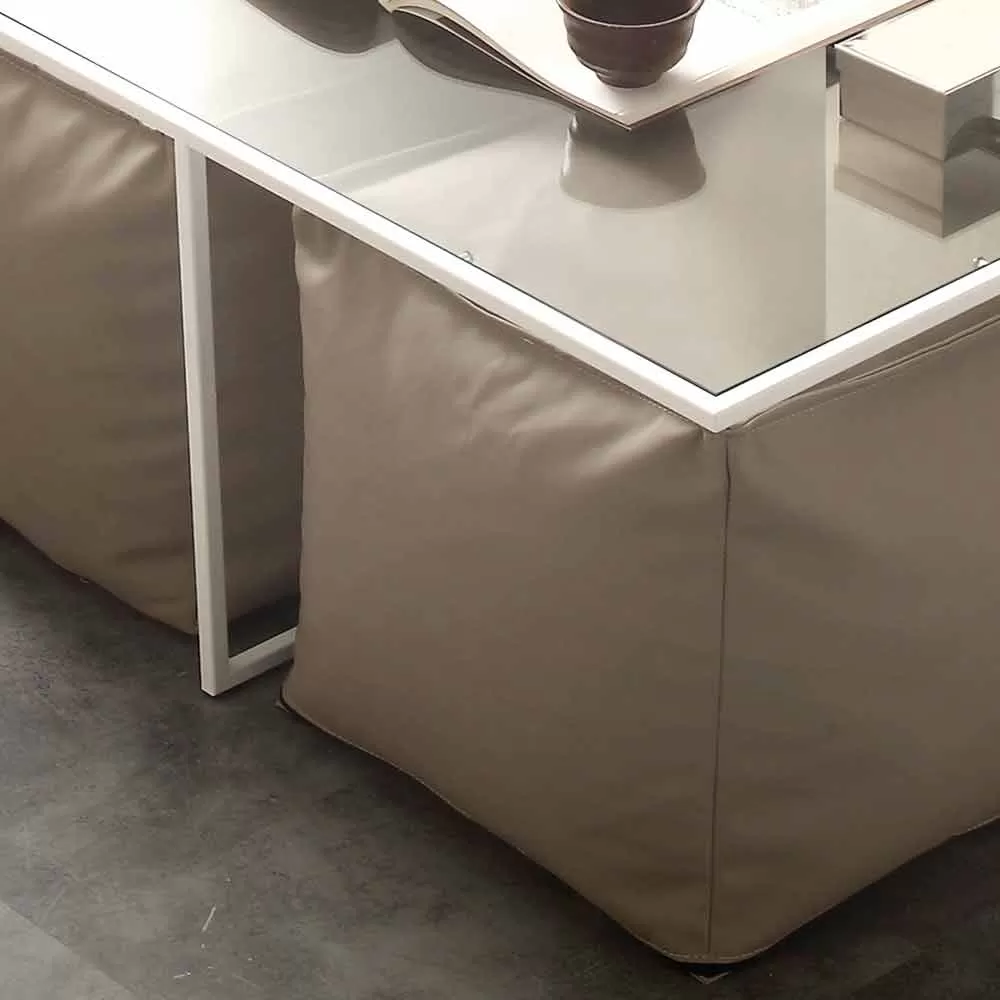 Modern coffee table with white metal frame and tempered glass table top (5 mm). Lula coffee table comes with 4 pouffes covered with High Quality eco-leather, available in different colours. The covers are removable.