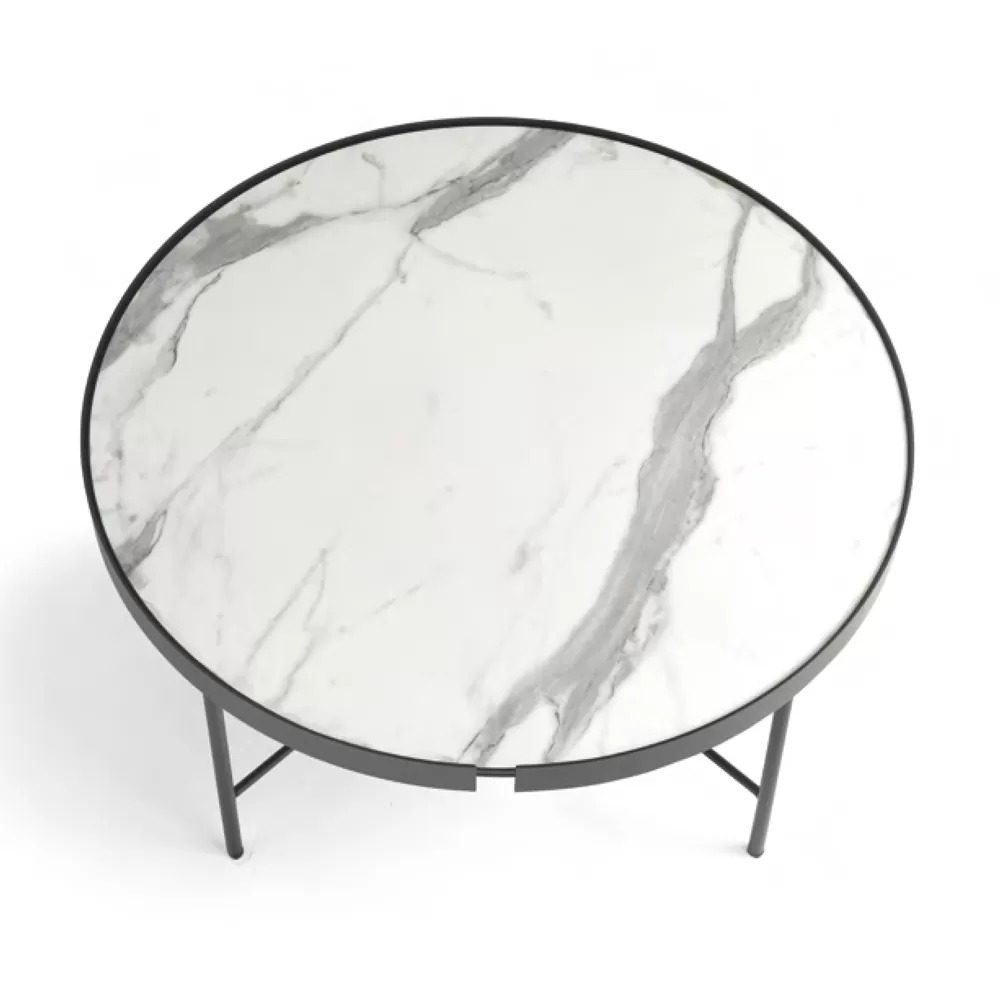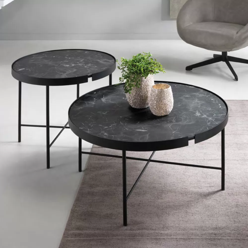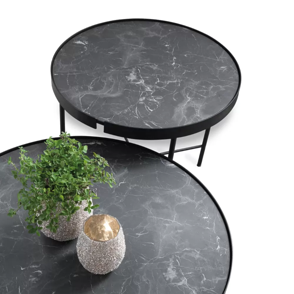 Coffee table made in Italy with round marble effect laminated glass top and black painted metal structure . A modern and elegant design characterizes this wonderful piece of furniture with a refined soul made unique by the refined touch of the marble effect top that enriches the aesthetics making it unique and avant-garde. The perfect combination of selected materials and finishes offers an ideal solution for completing living areas with a contemporary style in an original way, completing the atmosphere and creating perfect harmony with the surrounding furnishings. The two proposed sizes also allow you to create exclusive compositions capable of filling any living room with personality and character .