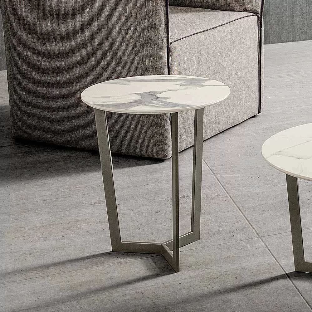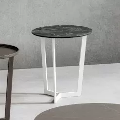 Coffee table made in Italy with round top in stratified hpl (thickness 10 mm) and base in metal painted with epoxy powders. A furnishing solution characterized by minimal shapes and an extremely versatile design whose value and quality stand out thanks to the elegance of the proposed finishes which make even the simplest and most essential of tables refined and innovative, enriching their aesthetics and completing at the same time the surrounding furniture in an exclusive and refined way. The result is a coffee table able to cover at the same time the role of practical support surface and decorative element of ideal class , thanks to its shape and its dimensions, to be used as a useful solution to complement your sofa on which store all the items you want to have close at hand. The material chosen for the construction of the top, HPL, enhances its functional side, a material that offers excellent resistance to chemical agents, abrasions and scratches while also ensuring a solid and robust surface capable of maintaining its characteristics unchanged over time. aesthetics.