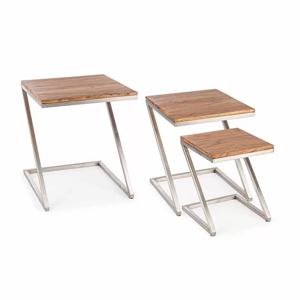 Composition of 3 square coffee tables made of acacia wood and steel.