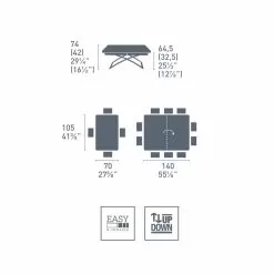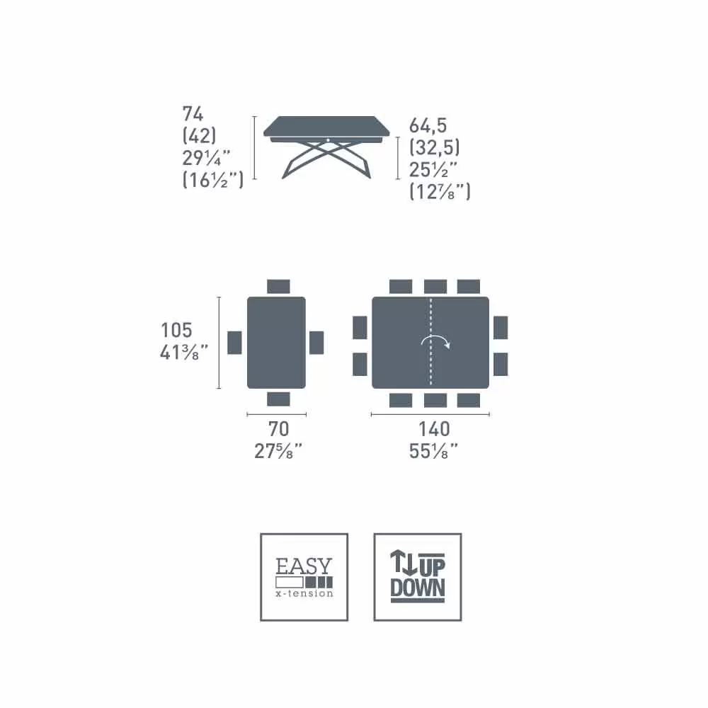 By pressing the button on the drawer, you can adjust the height in 7 different positions (from 32.5 cm to 74 cm). The veneered top, on the other hand, measures 105 cm x 70 cm, extending to 105 x 140 cm thanks to the practical butterfly leaf.