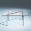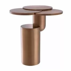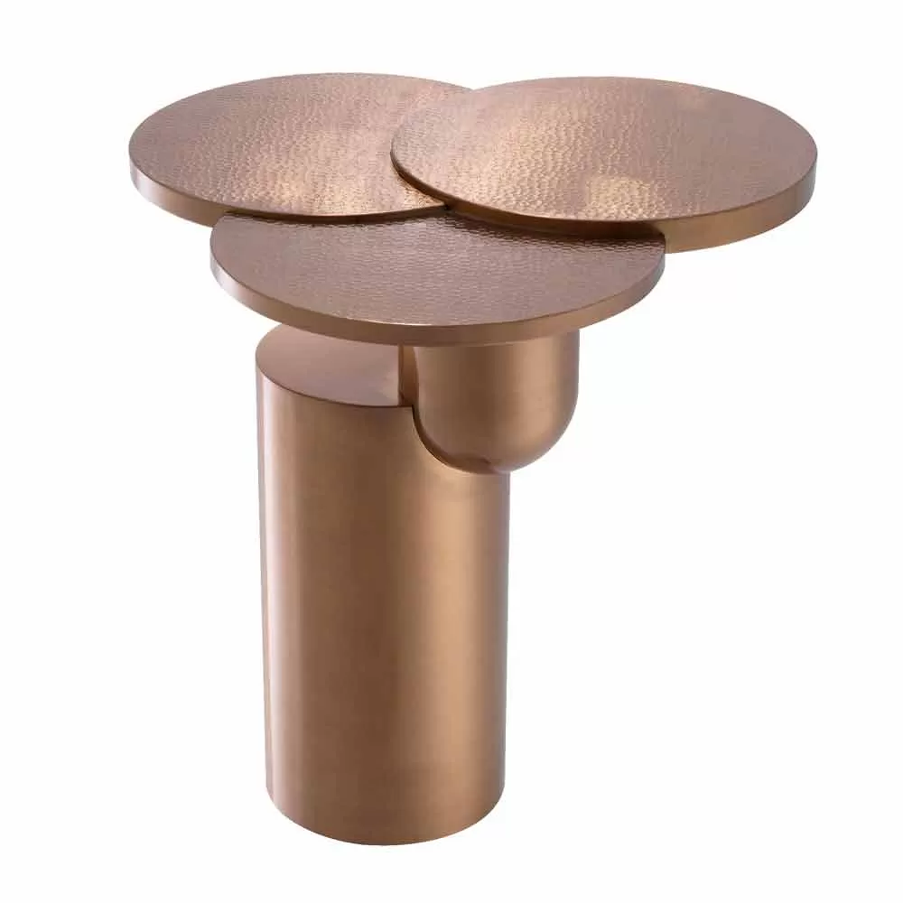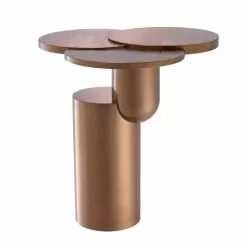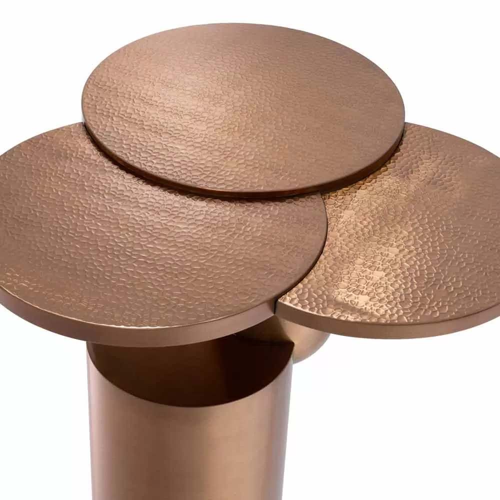 This coffee table has a structure entirely made of stainless steel in a brushed copper finish and has a top made up of 3 round plates that differ slightly in height.