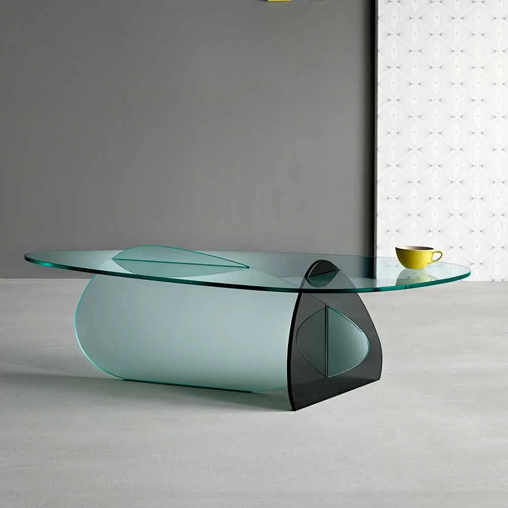 Modern design coffee table in transparent, smoked and etched glass, handcrafted in Italy.