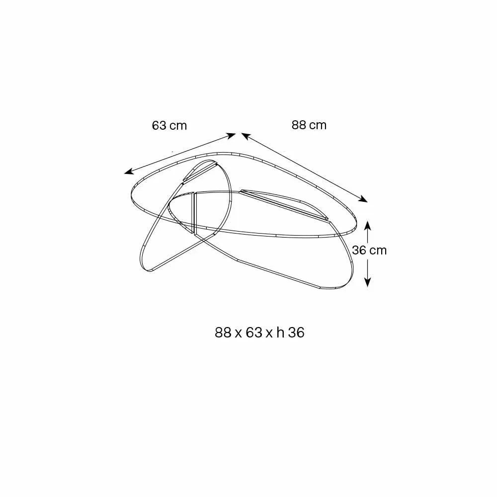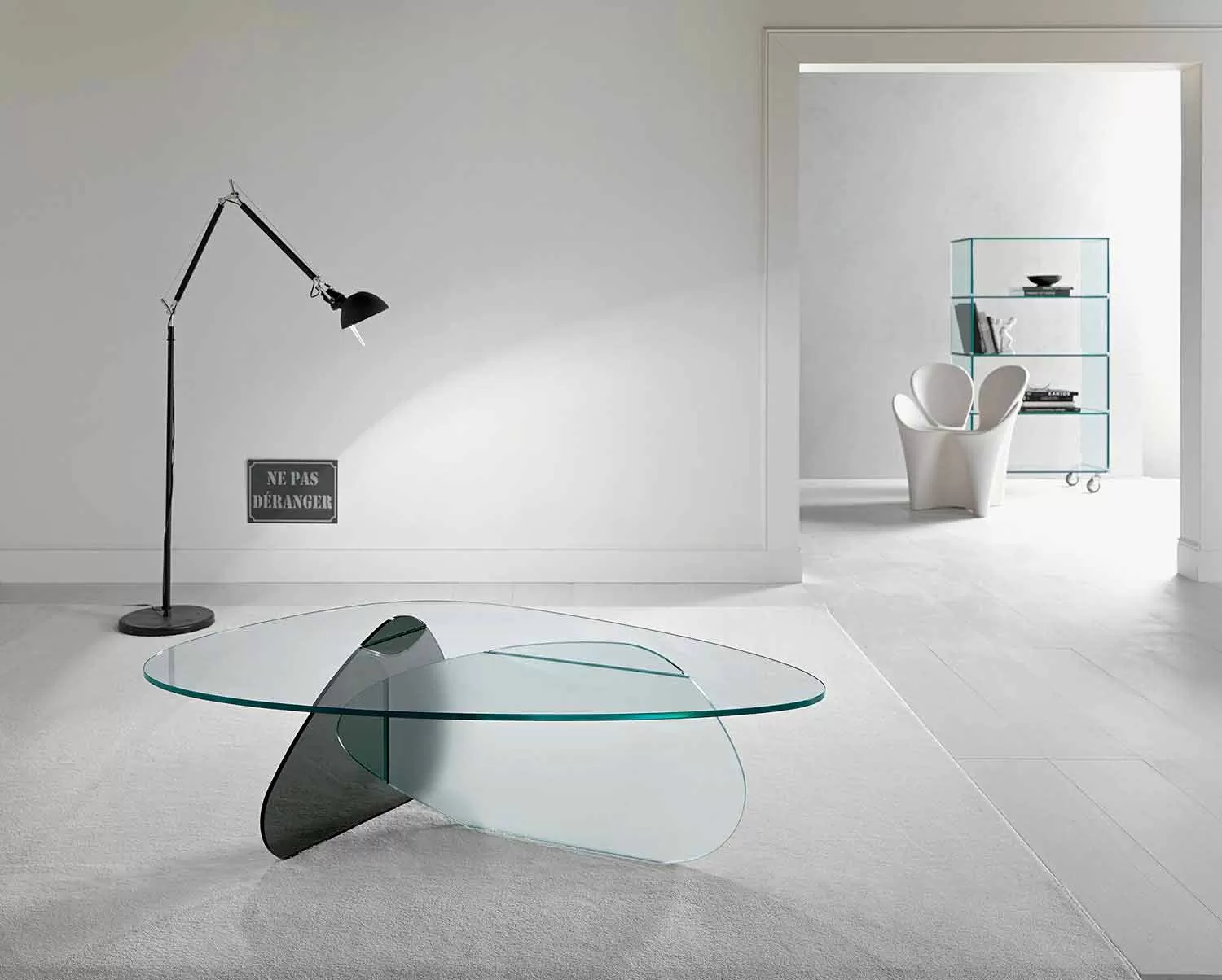 Composed of three transparent, smoked and etched glass shelves (12mm thick) that seem to cross each other forming the volume of the table.