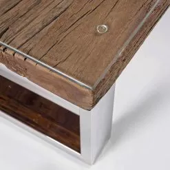 Top in recycled wood with natural finish and tempered glass . Legs in stainless steel .
