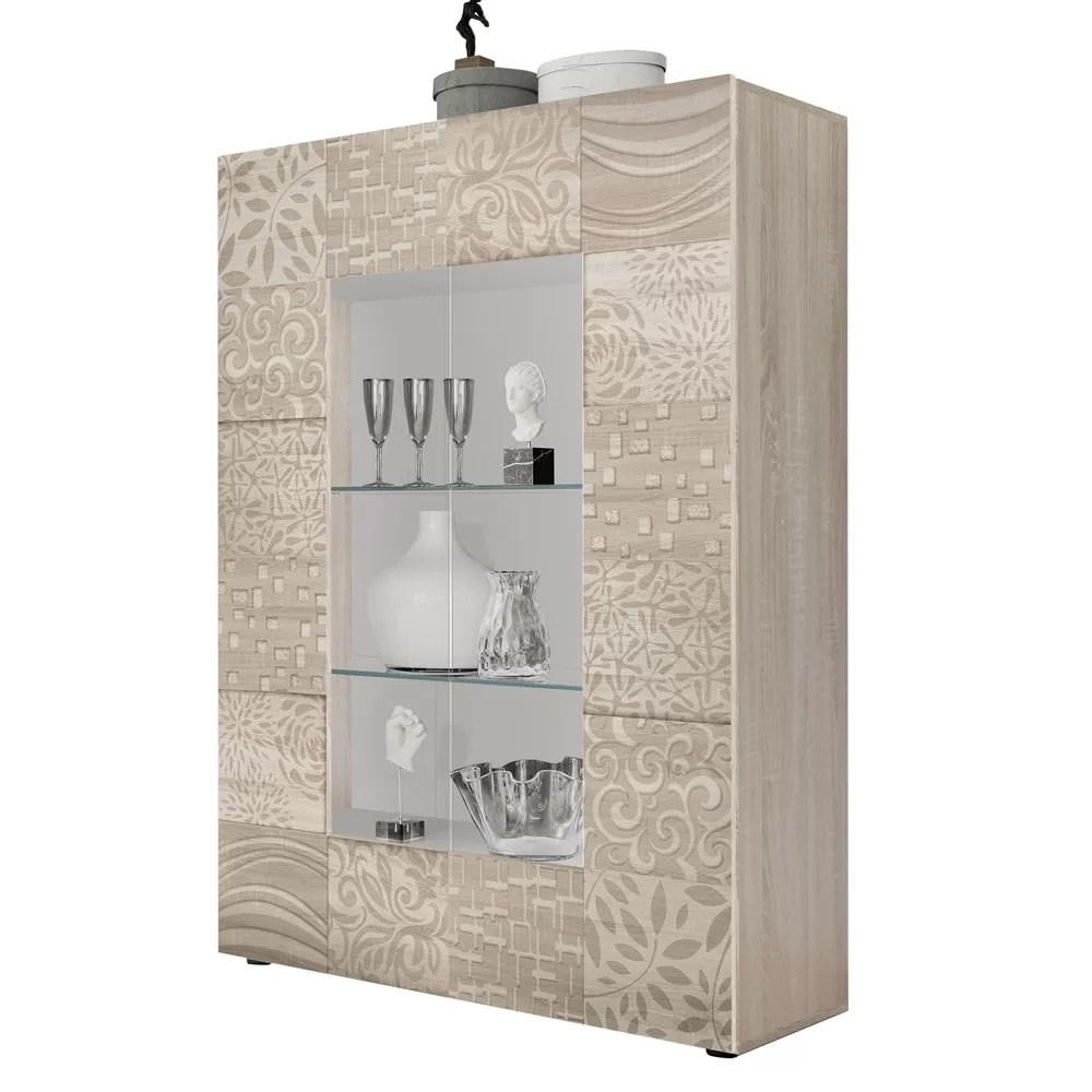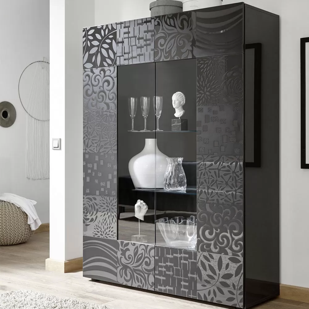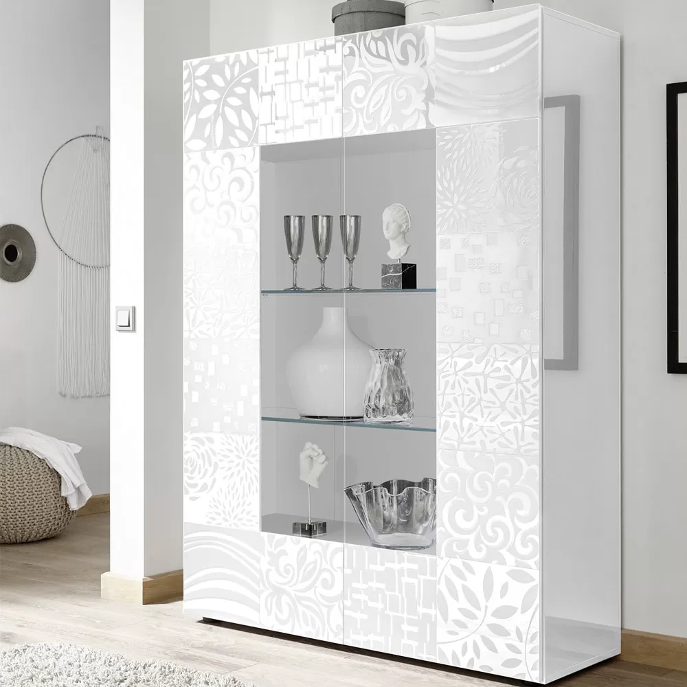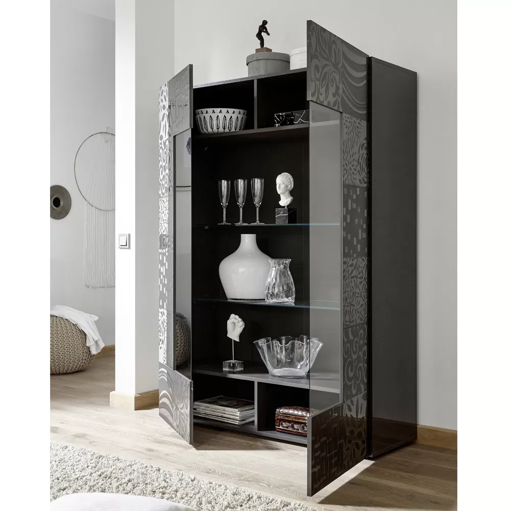 Living room showcase made of agglomerated wood covered with melamine characterized by 2 doors with central part in glass without handles equipped with hinged opening and decorated on the perimeter with elegant three-dimensional screen printing inside which there are 4 practical shelves , 2 of which matching the structure and 2 in glass. A piece of furniture that comes from a 100% Made in Italy production characterized by a refined and contemporary design capable of enriching the most varied areas of the house with an exclusive and refined touch .
