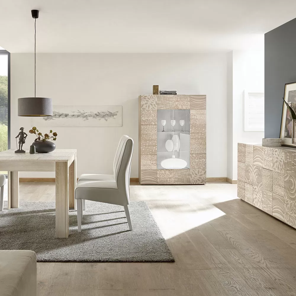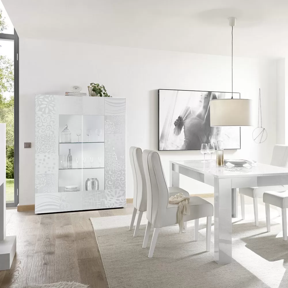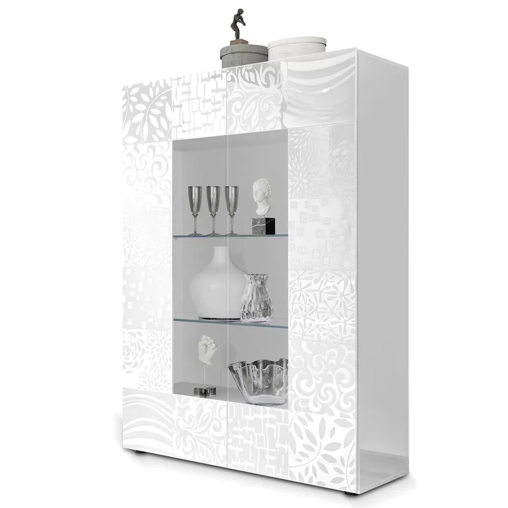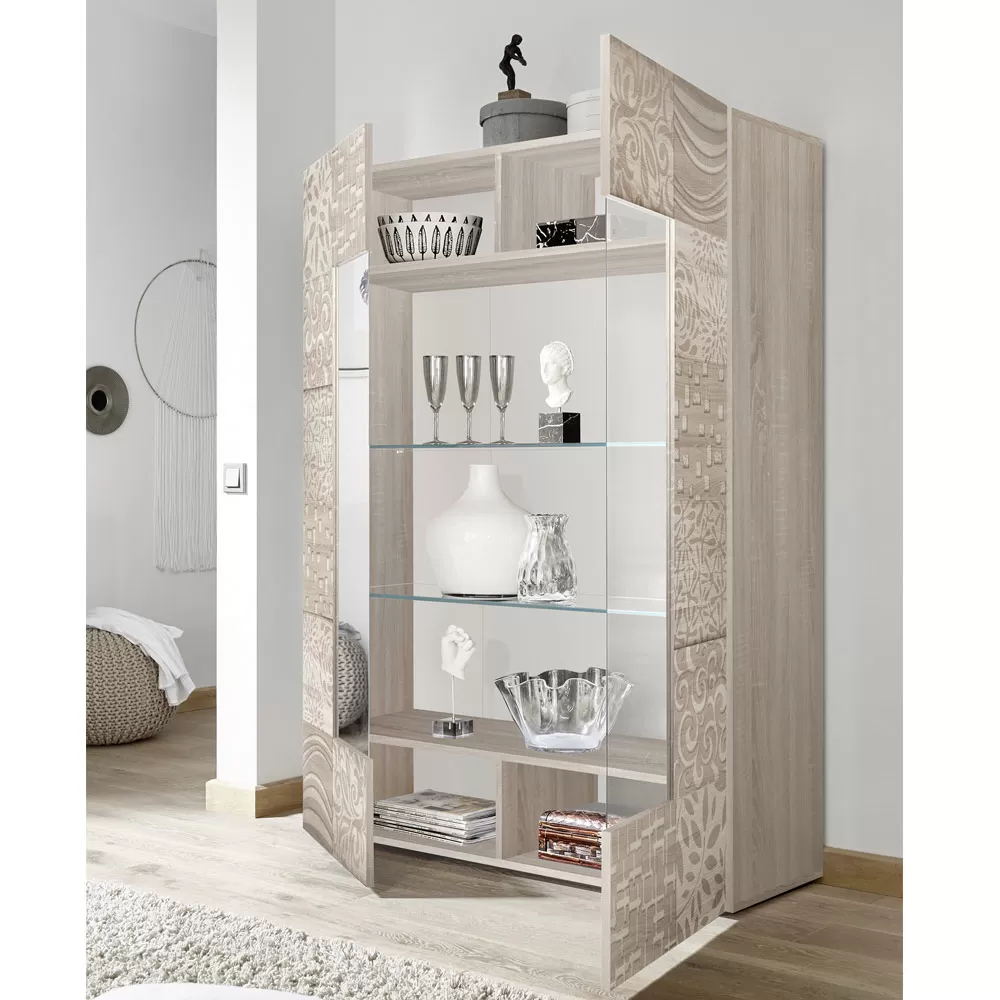Living room showcase made of agglomerated wood covered with melamine characterized by 2 doors with central part in glass without handles equipped with hinged opening and decorated on the perimeter with elegant three-dimensional screen printing inside which there are 4 practical shelves , 2 of which matching the structure and 2 in glass. A piece of furniture that comes from a 100% Made in Italy production characterized by a refined and contemporary design capable of enriching the most varied areas of the house with an exclusive and refined touch .