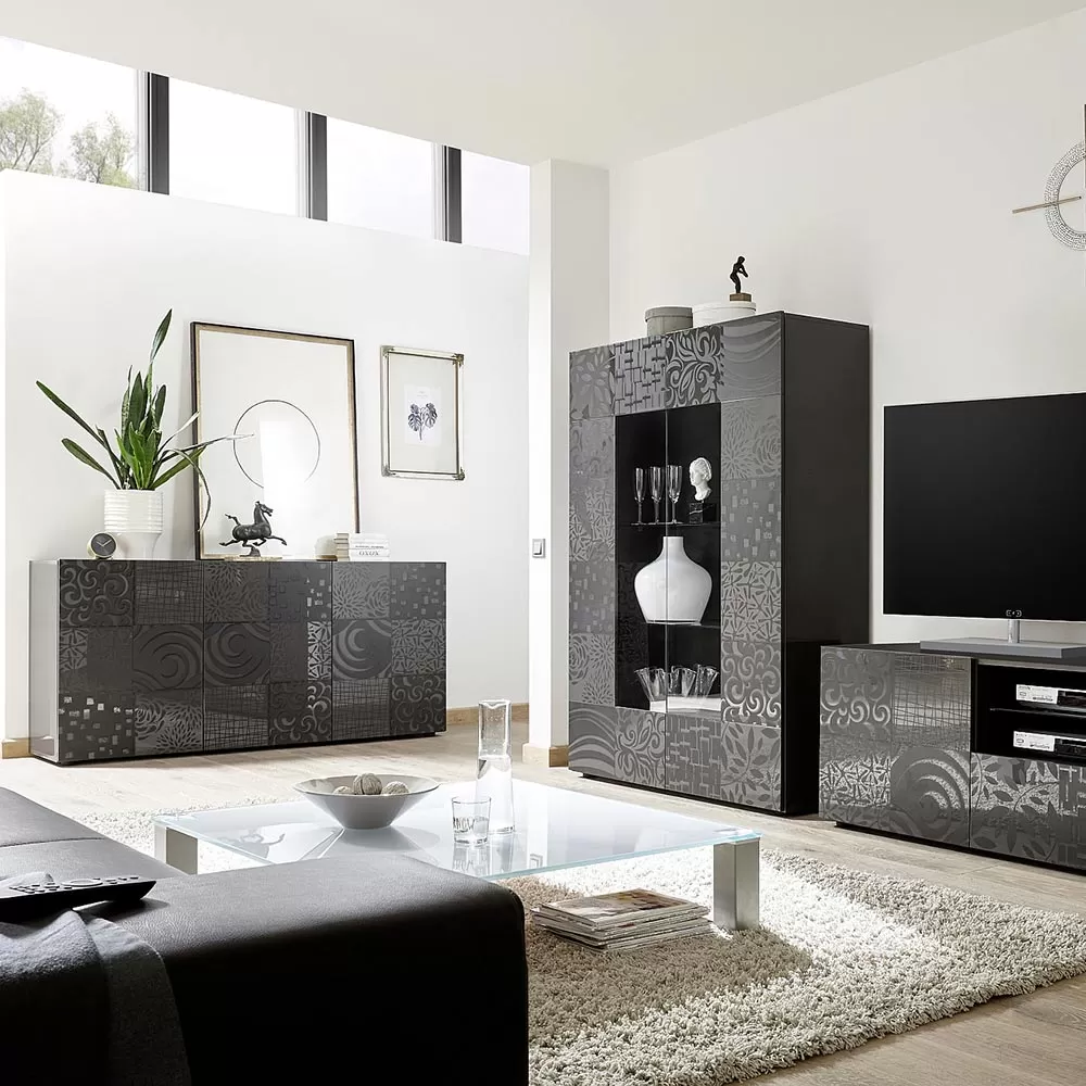 Living room display cabinet in laminated wood with 2 screen-printed doors Made in Italy.