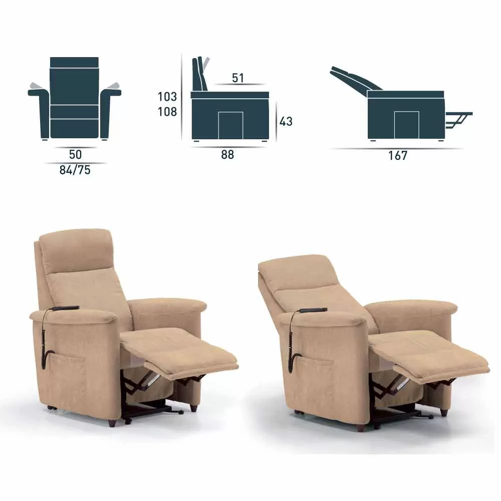 The Via Firenze lift chair has a 2-motor mechanism characterized by a motorized relaxation movement with the aid of a remote control.