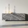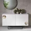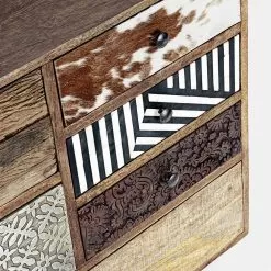 The peculiarity is given by the front surface of the 7 drawers made of recycled mango and acacia wood with applications in metal and leather with a water-based paint finish.