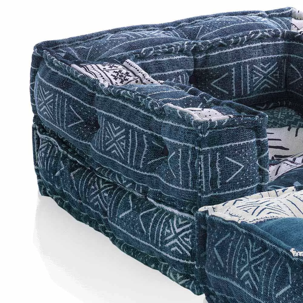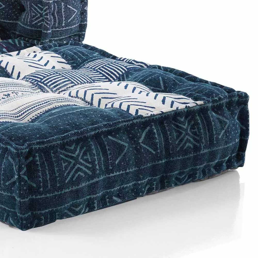 Ethnic lounge chaise longue armchair made of gray or blue and white velvet.