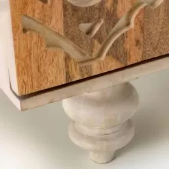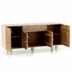 Entirely made of mango wood with whitewash finish and completed by two doors with internal shelf, a drawer and two central doors; all embellished with openwork motifs.