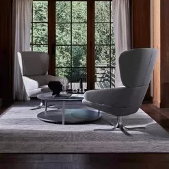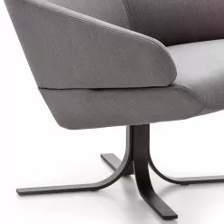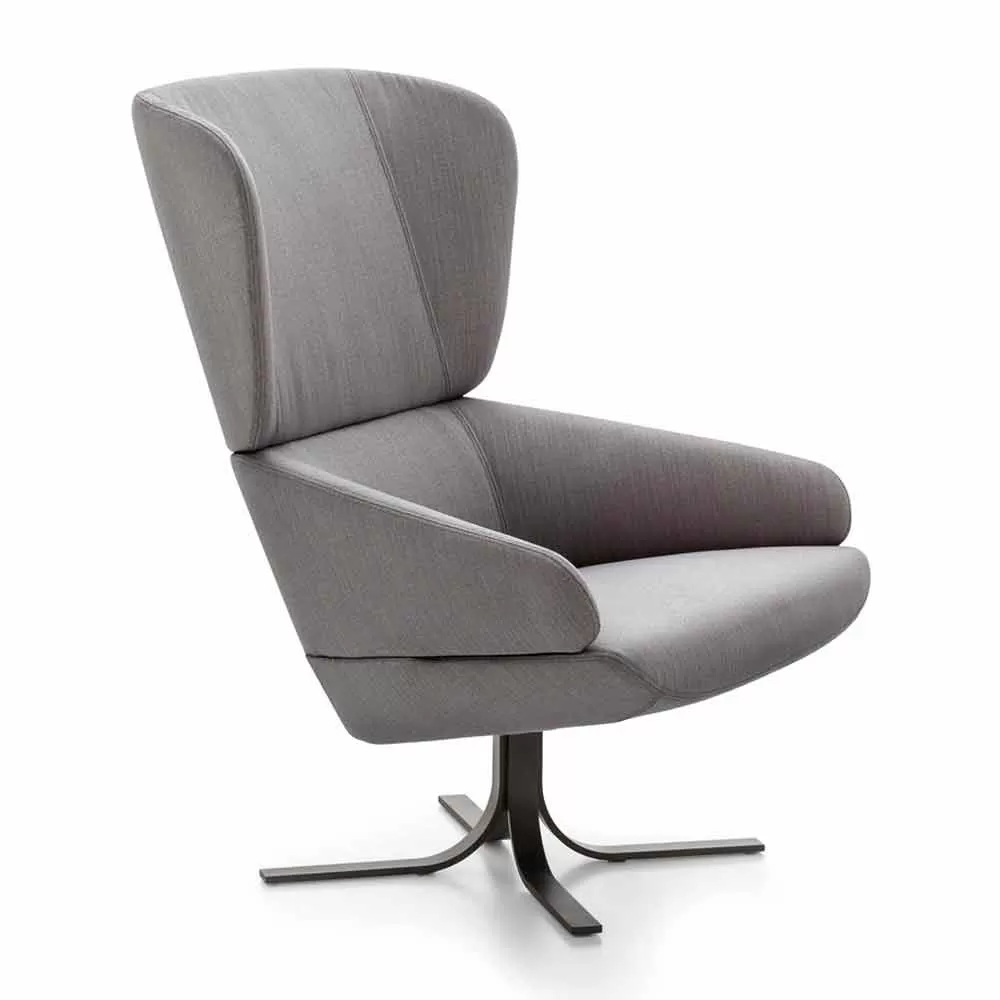 Elegant living room armchair made in Italy with swivel base in anthracite finish metal and shell with internal steel structure padded with non-deformable polyurethane foam and entirely covered in non-removable fabric. Functionality and elegance are the strengths of this furnishing accessory characterized by a shaped shell enriched by passing seams that emphasize its shapes and volumes. The harmony of its lines contains all the comfort that the armchair offers together with an extremely innovative and original design made unique and particularly interesting by the creative swivel base. Its captivating aesthetic also proves versatile, therefore adaptable to any living area within which it captures all attention thanks to a strong and imposing personality.