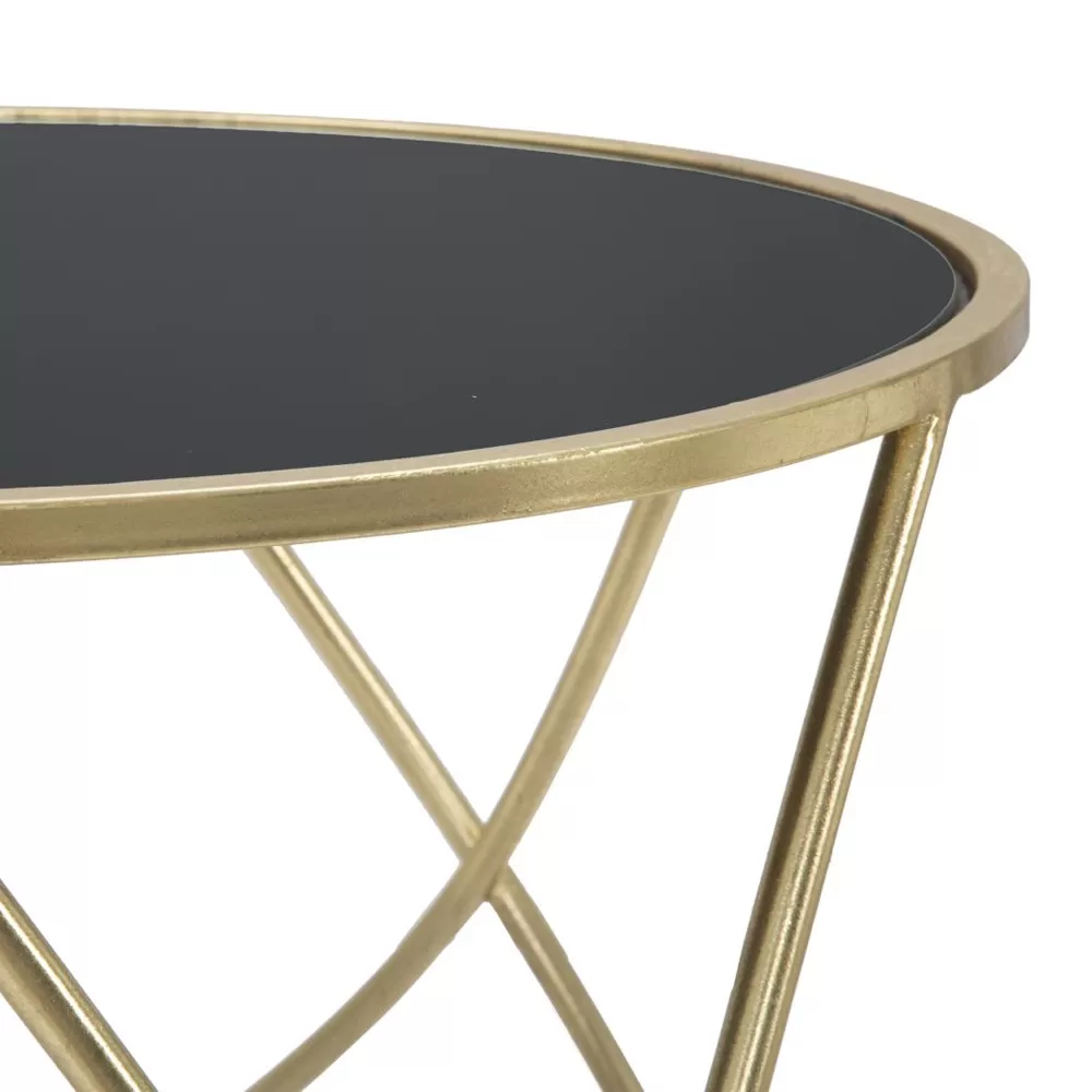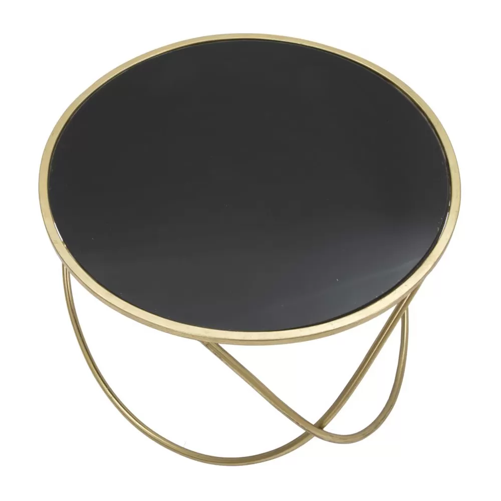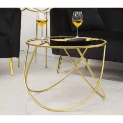 Coffee table with golden finish iron structure with round black glass top . A complement marked by a simple and versatile design but at the same time exclusive and avant-garde. Its uniqueness is given by the perfect combination of the touch of elegance given by the golden base and the refined element of the black glass. What is striking about its aesthetics is the use of soft shapes and sinuous lines that give life to a refined and eclectic coffee table, capable of adapting to any modern stylistic situation thanks to its versatility and its contemporary character.