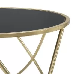 Round coffee table in black glass with golden iron structure.