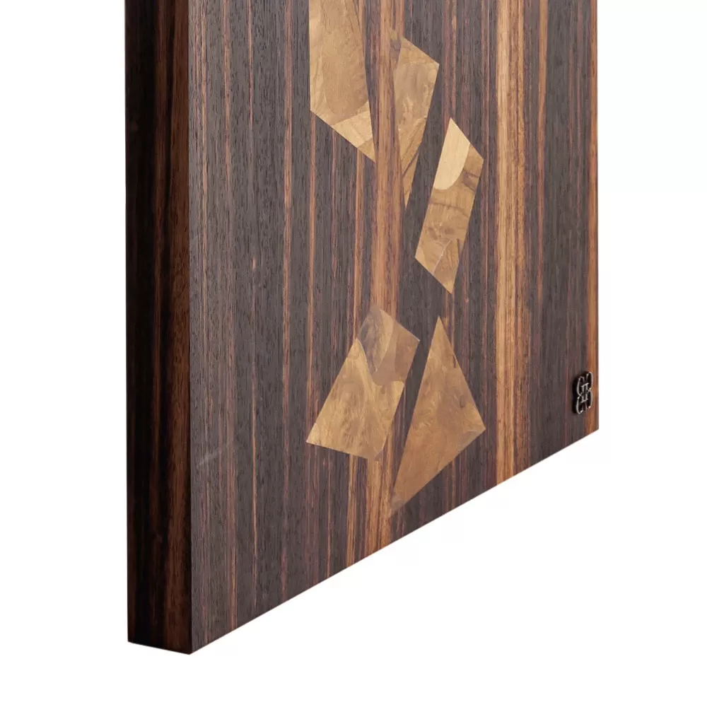 Its structure is in ebony veneered wood and walnut-rooted carganello inserts.