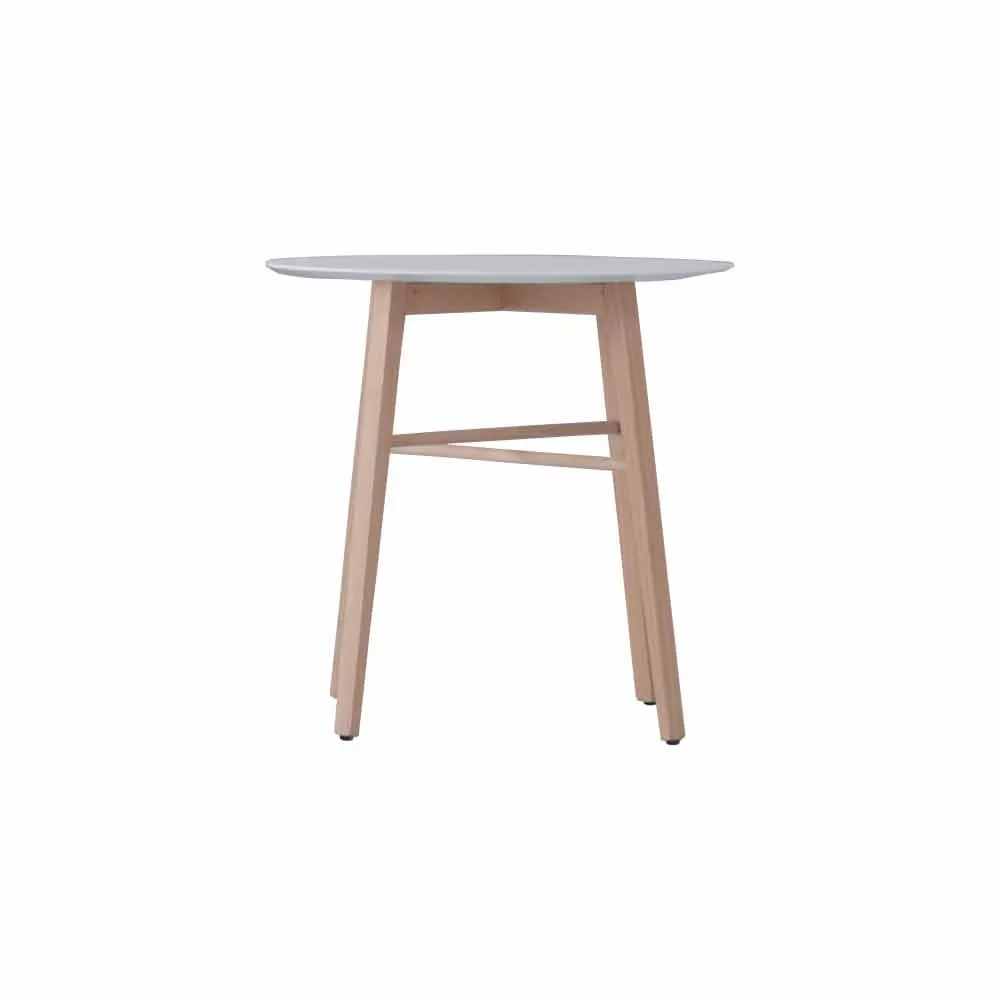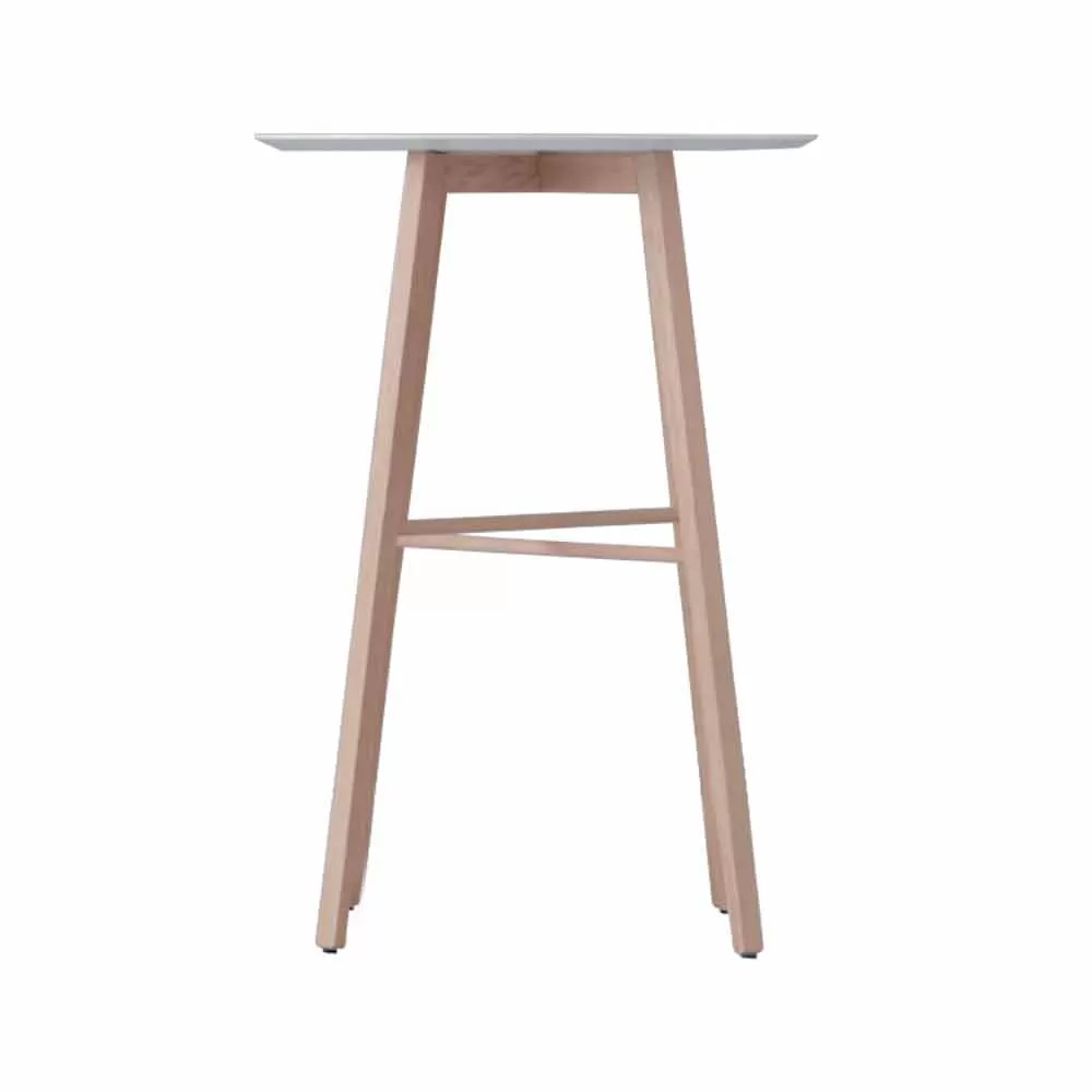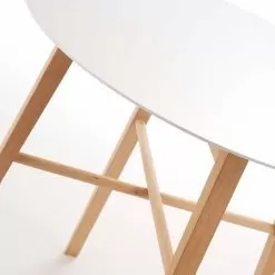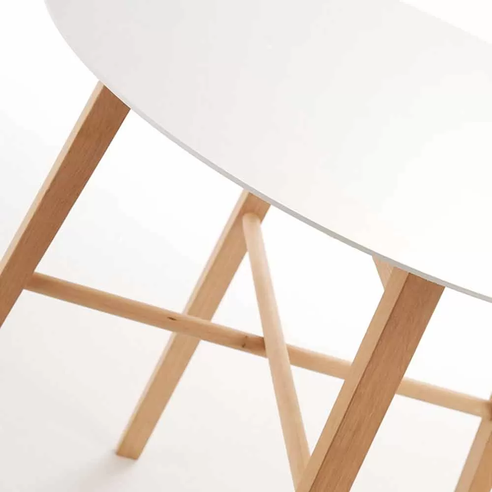 In fact, the cross-shaped base in solid oak with four legs supports a MDF top covered with a white polymer sheet.