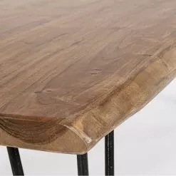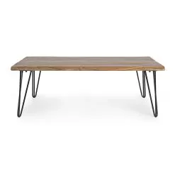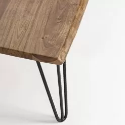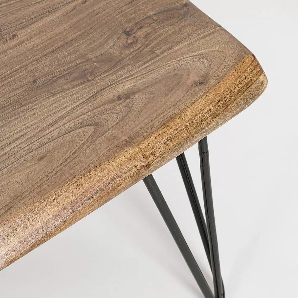 This living room table features epoxy powder coated steel legs to assemble and an acacia wood top (original trunk sections) with protective acrylic finish.