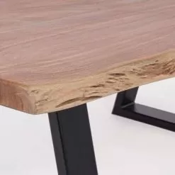 Top in acacia wood , legs in epoxy powder coated steel . Finish based on polyurethane paint.