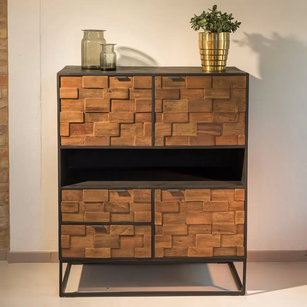 Indoor sideboard made with 3 doors and 2 drawers with open compartment in patchwork recycled wood in natural coffee color and body in brushed black metal .