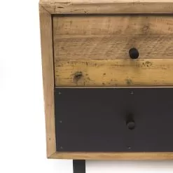 Indoor sideboard made of natural coffee colored recycled wood with 1 door, 2 wooden front drawers, 2 black metal front drawers and metal feet.