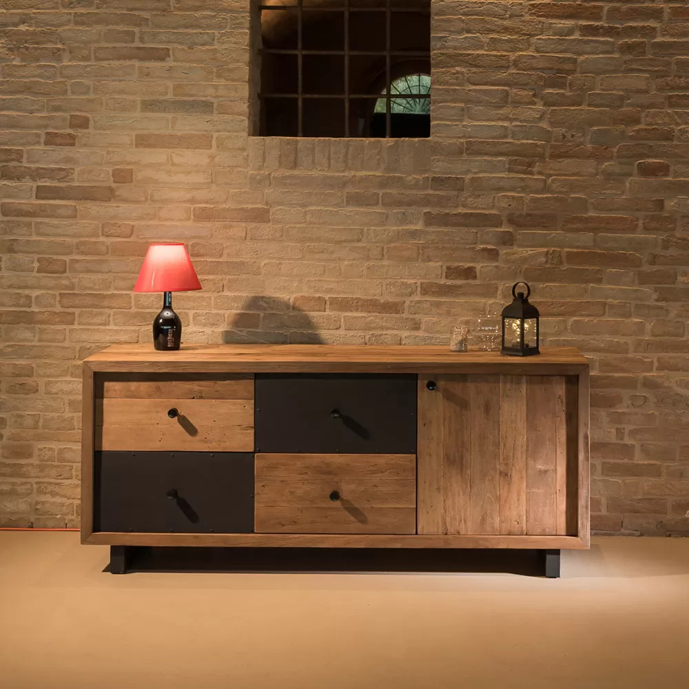 This furnishing set is literally unique precisely because it embodies the peculiar history of lived matter. The processing takes place for the most part according to artisanal procedures . Every scratch and imperfection, every scar on the wood, bears witness to the originality of a past that takes on new life. The solid wood legally recycled from old artifacts, boats and abandoned buildings is expertly treated and brushed in order to regain dignity and shine. This product combines the essence of rustic taste with the shapes of contemporary design and with some details of the industrial style .